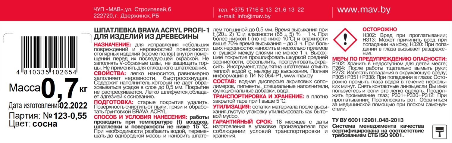 Шпатлевка по дереву BRAVA Профи-1 0,7 кг Сосна