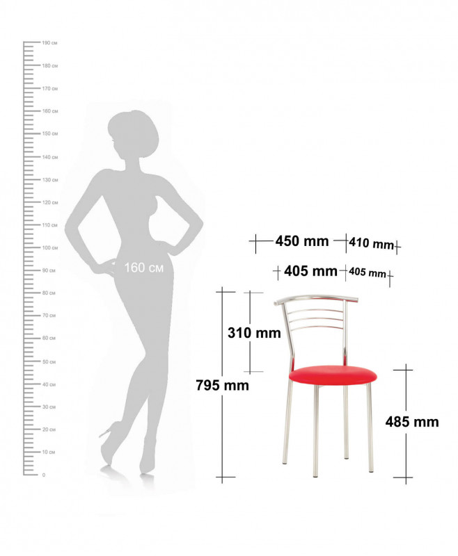 ГабаритыВысота изделия: 795 мм Высота сидения: 485 мм Высота спинки: 310 мм Ширина изделия: 450 мм Глубина изделия: 410 мм Ширина сидения: 405 мм Глубина сидения: 405 мм