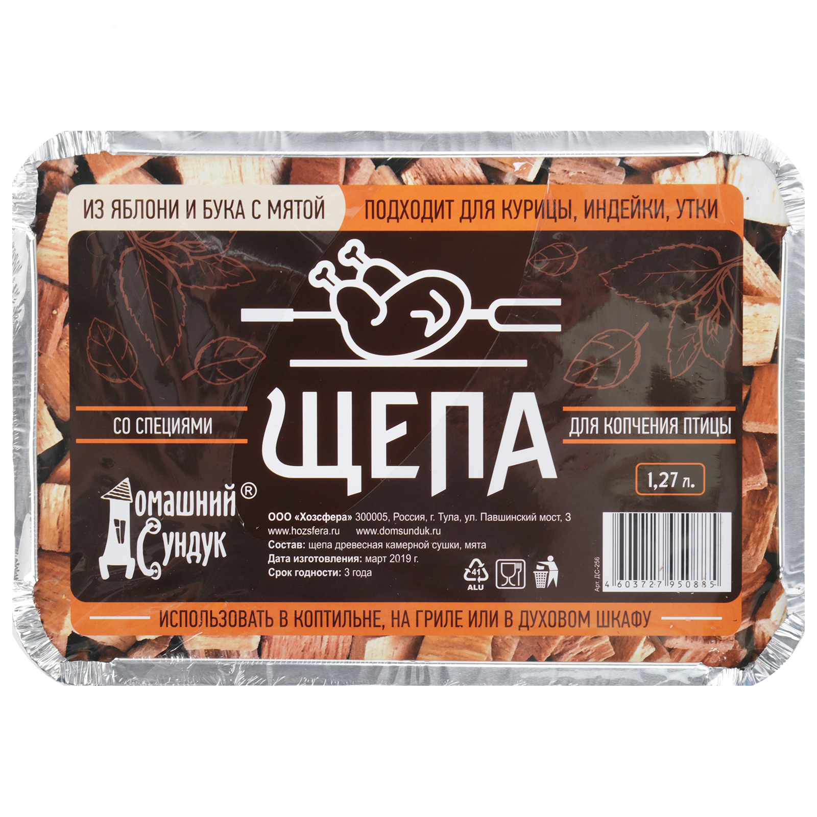 Коптильня разовая для копчения птицы, специи в лотке, яблоня и бук с мятой, 1,27 л.