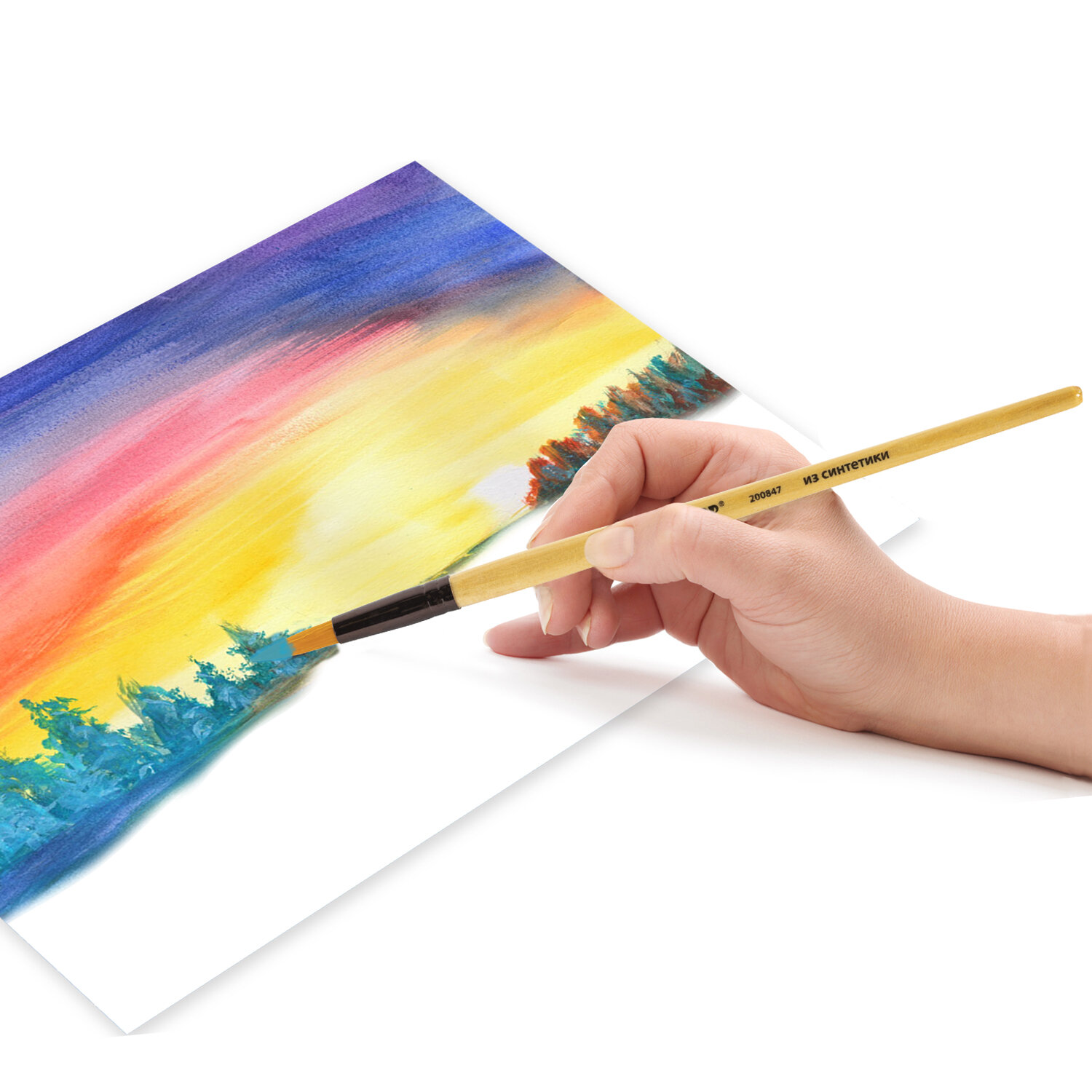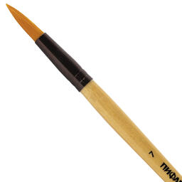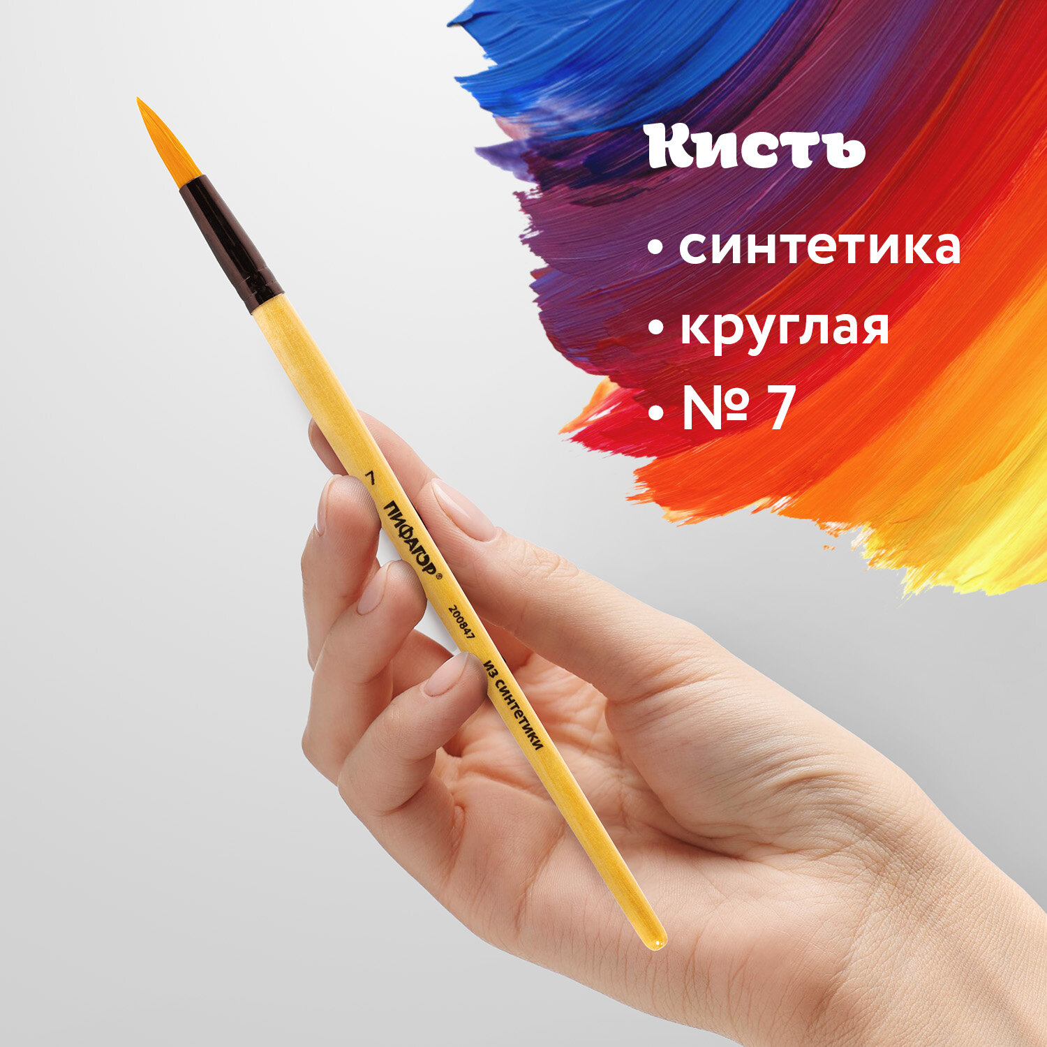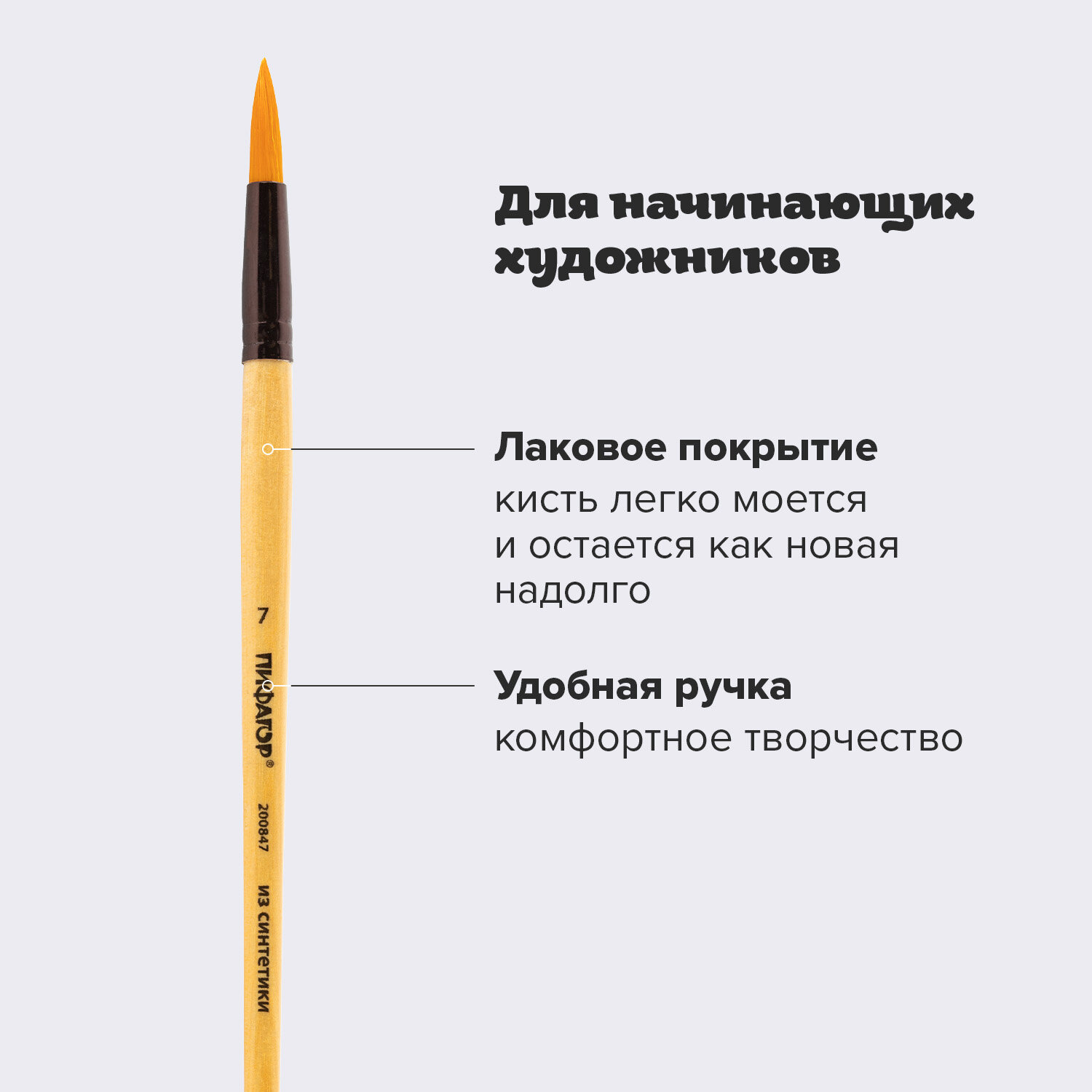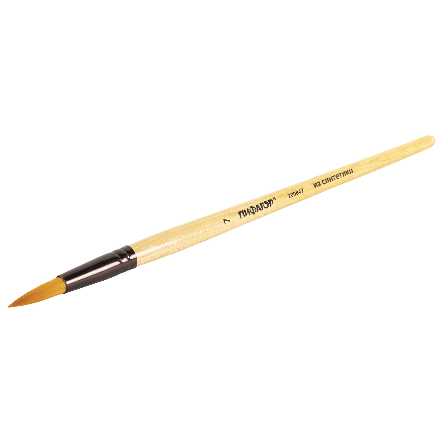 Описание товара 200847, (цена за 10 шт.) Кисть ПИФАГОР, СИНТЕТИКА, круглая, № 7, деревянная лакированная ручка, с колпачком, пакет с подвесом, 200847
