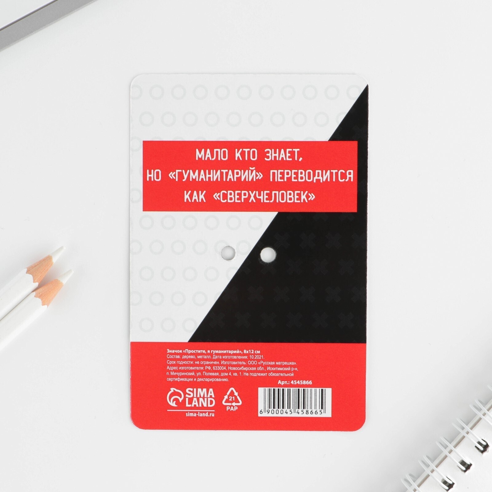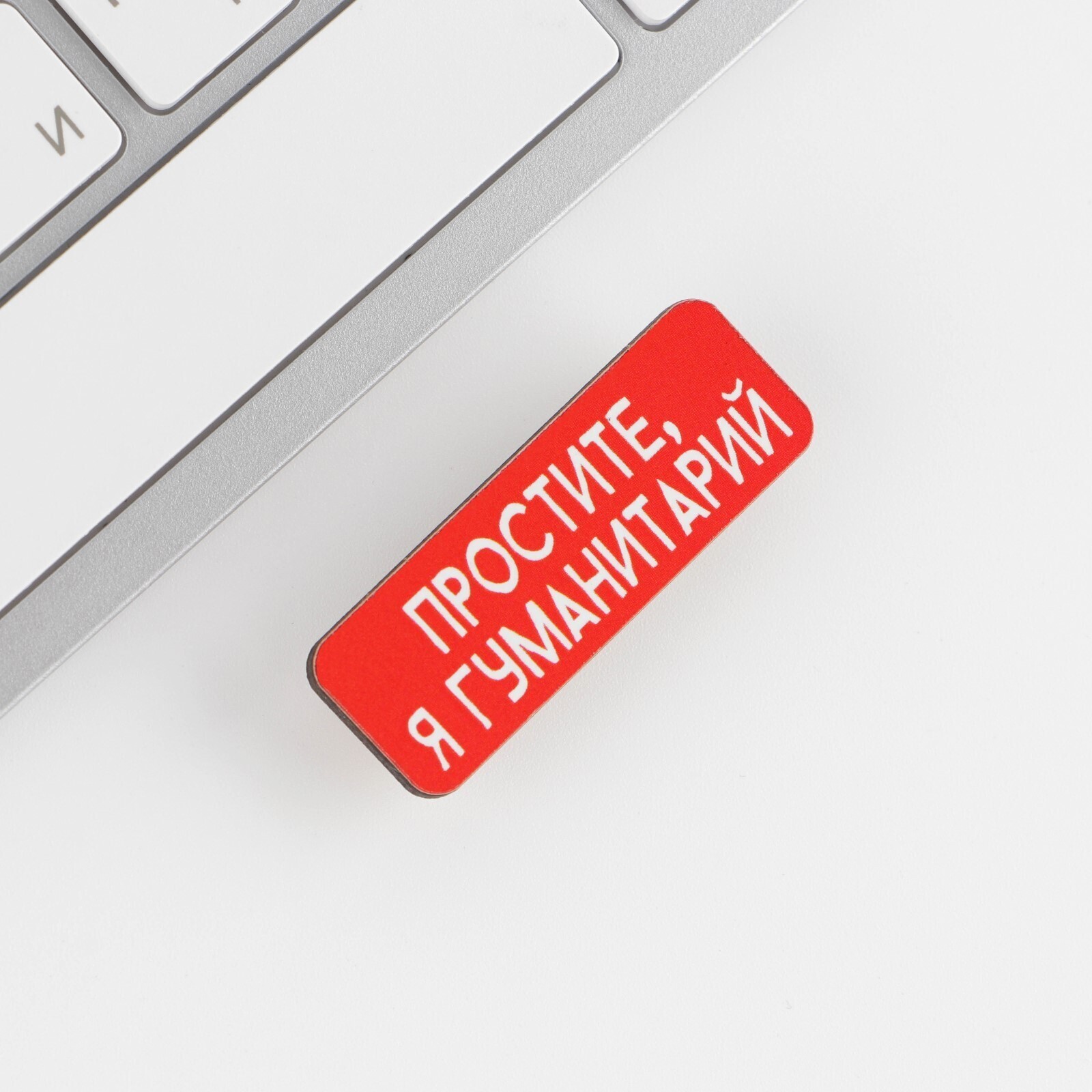 Значок «Простите, я гуманитарий». Яркий способ выделить себя в толпе, показать свою индивидуальность. Значок лёгкий и долговечный, надежно и безопасно крепится с помощью булавки к одежде, что позволяет использовать его без ограничений для всех возрастных категорий.