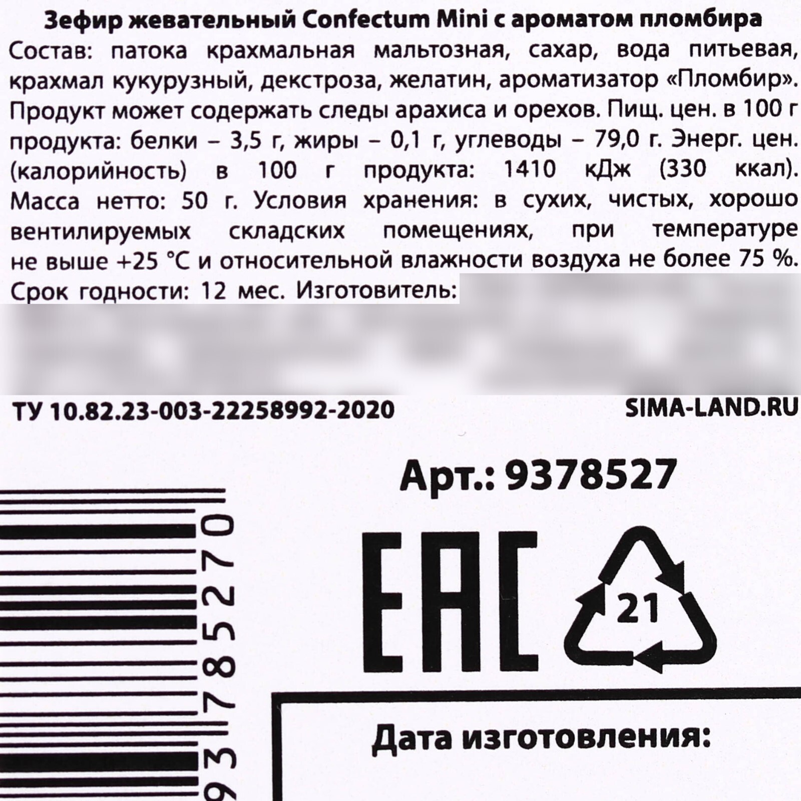 Состав: патока крахмальная мальтозная, сахар, вода питьевая, крахмал кукурузный, декстроза, желатин, ароматизатор "Пломбир".