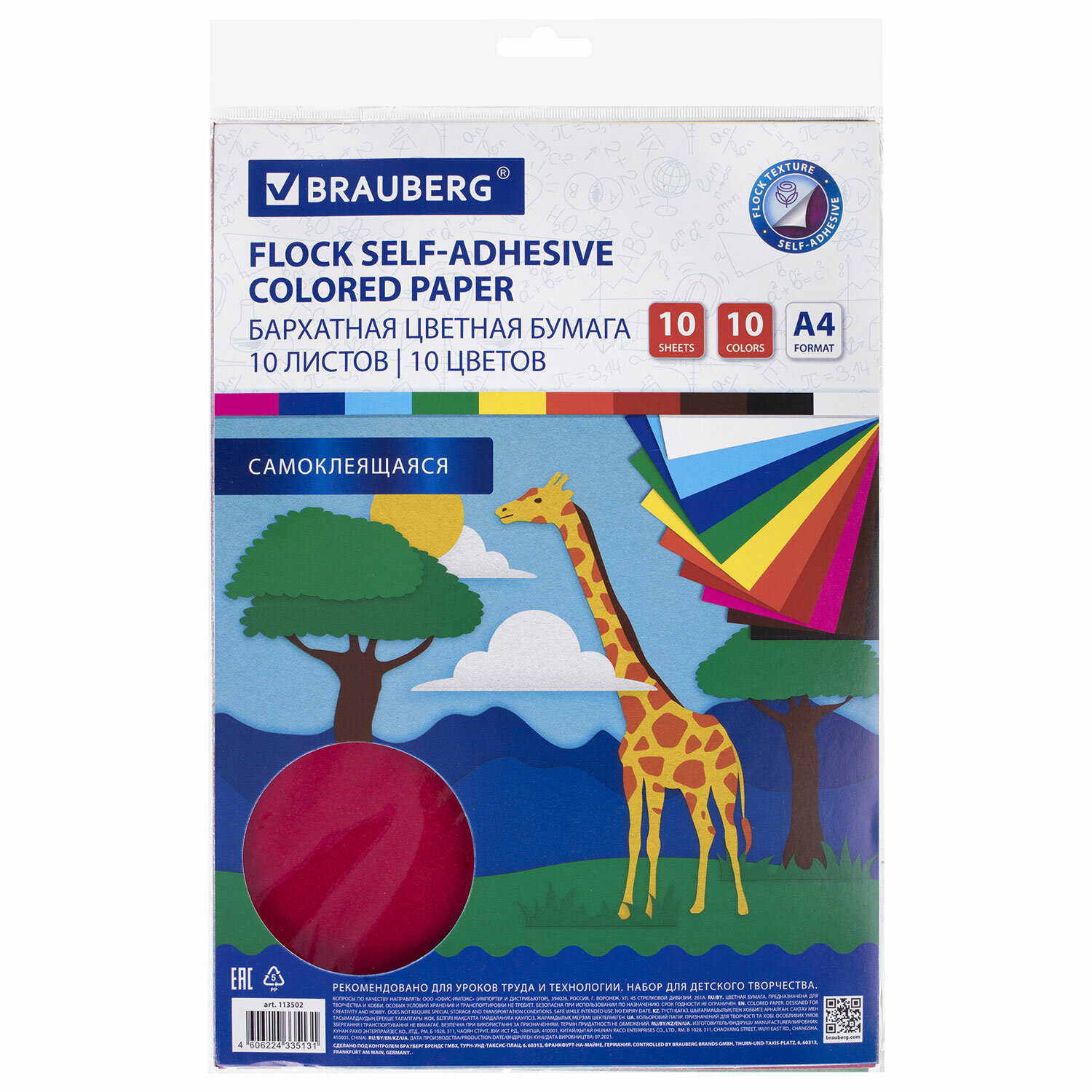 Описание товара 113502, Цветная бумага А4 БАРХАТНАЯ САМОКЛЕЯЩАЯСЯ, 10 листов 10 цветов, 110 г/м2, BRAUBERG, 113502