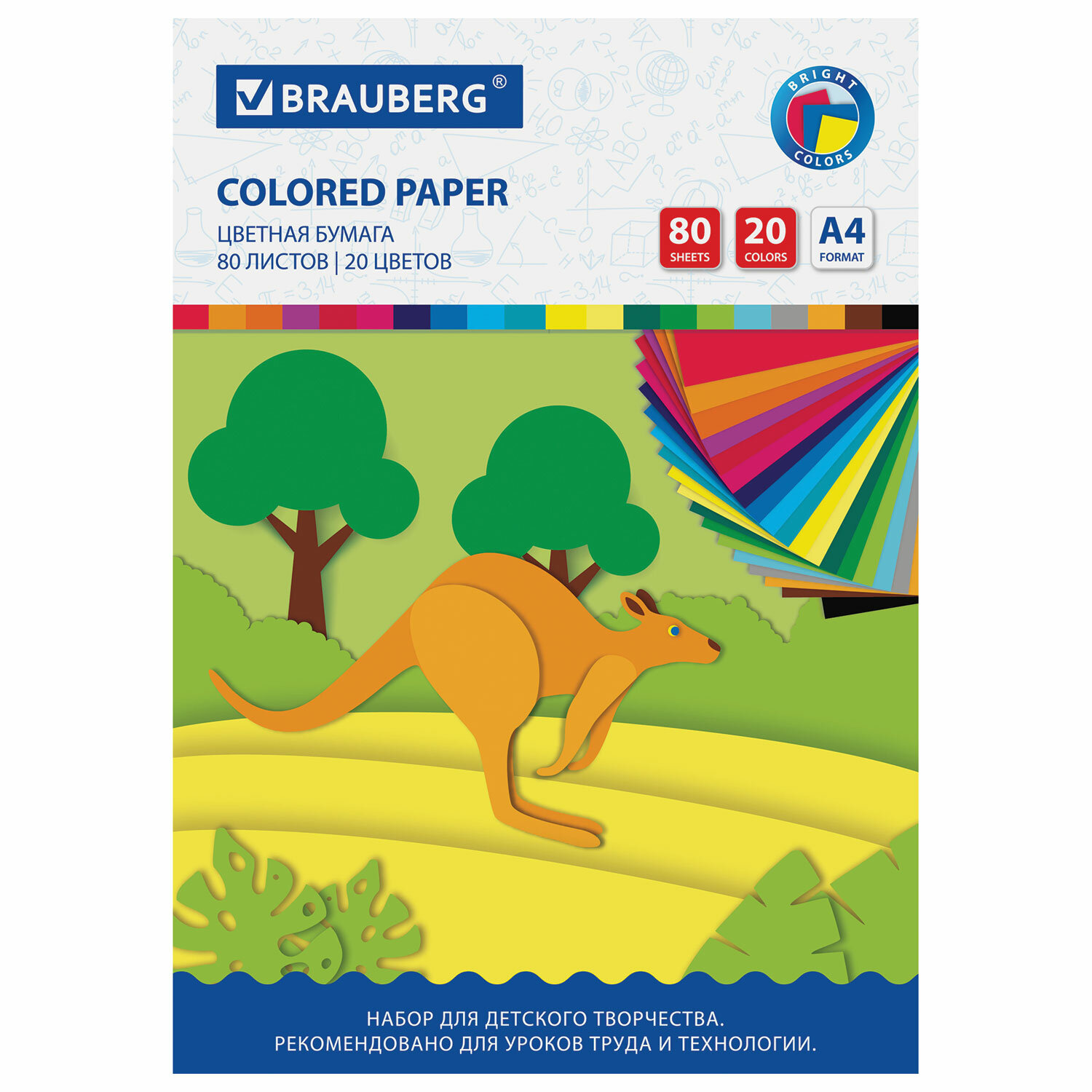 113539, Цветная бумага А4 офсетная, 80 листов 20 цветов, в папке, BRAUBERG, 200х290 мм, "Кенгуру", 113539