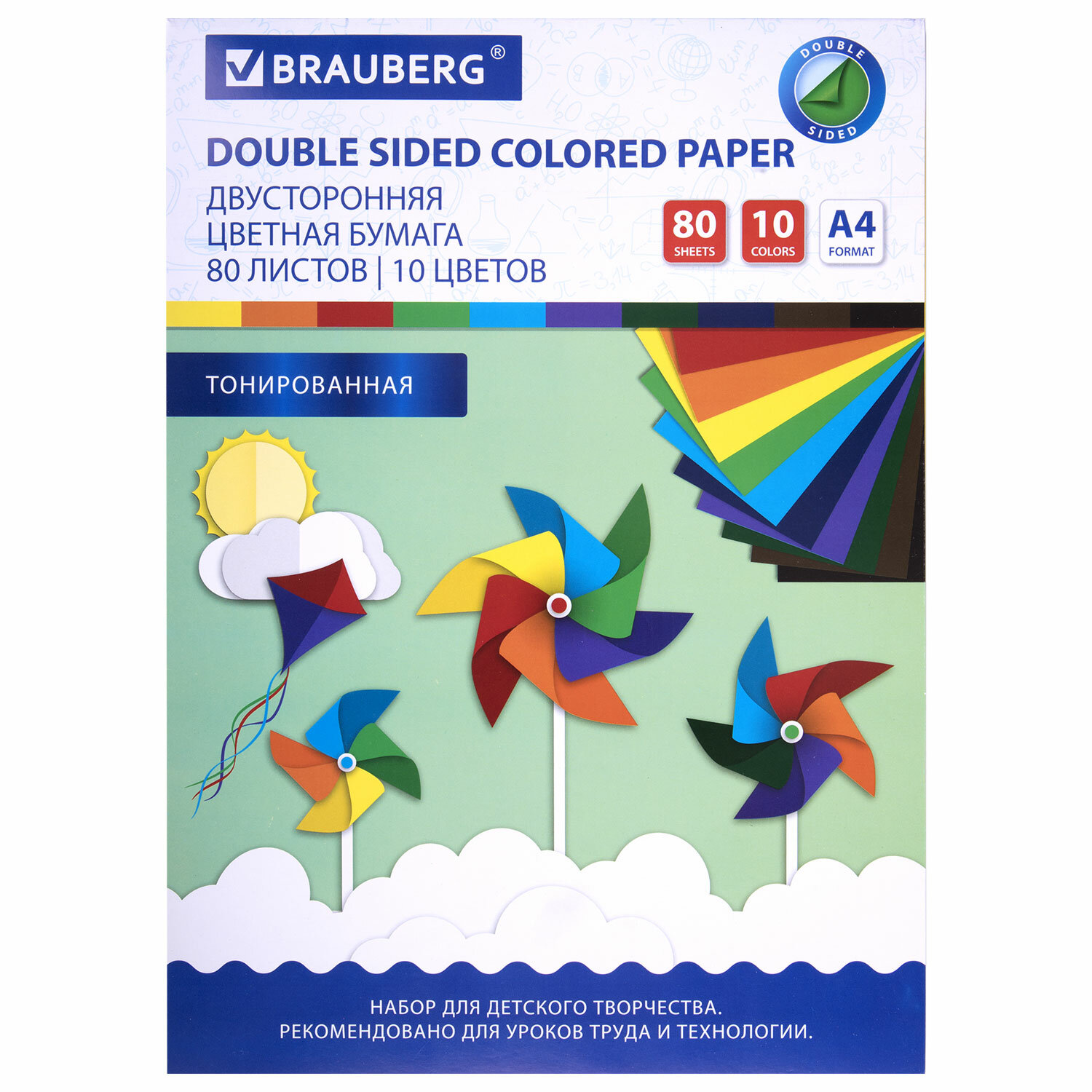 Описание товара 113503, Цветная бумага А4 ТОНИРОВАННАЯ В МАССЕ, 80 листов 10 цветов, склейка, 80 г/м2, BRAUBERG, 113503