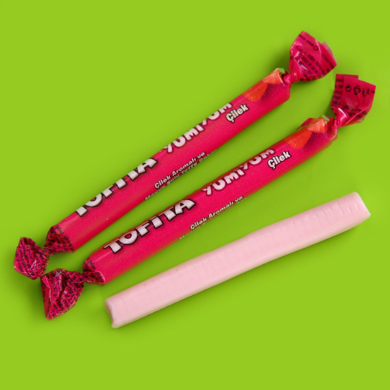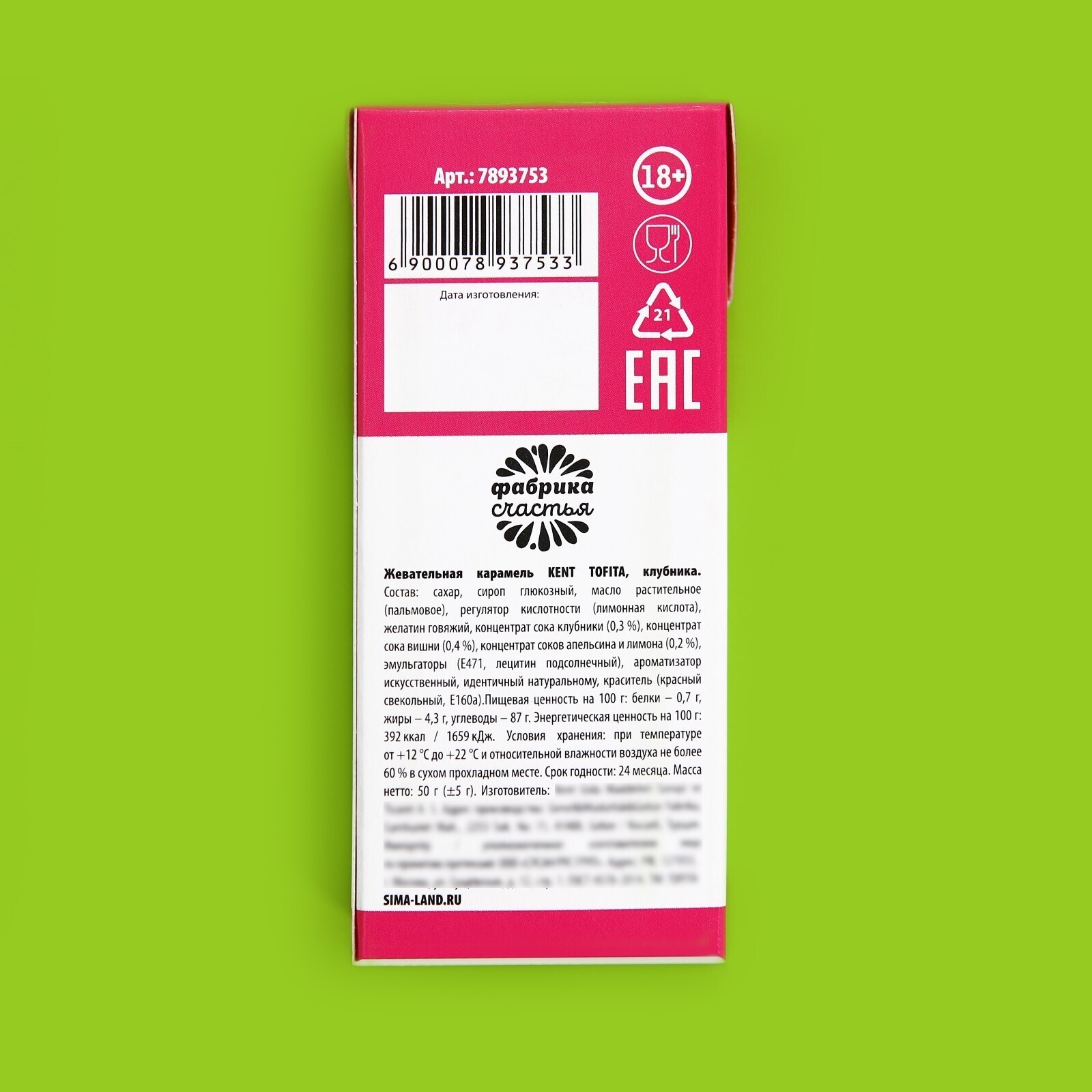 Состав: сахар, сироп глюкозный, масло растительное (пальмовое), регулятор кислотности (лимонная кислота), желатин говяжий, концентрат сока клубники (0,3 %), концентрат сока вишни (0,4 %), концентрат соков апельсина и лимона (0,2 %), эмульгаторы (Е471, лецитин подсолнечный), ароматизатор искусственный, идентичный натуральному, краситель (красный свекольный, Е160а).