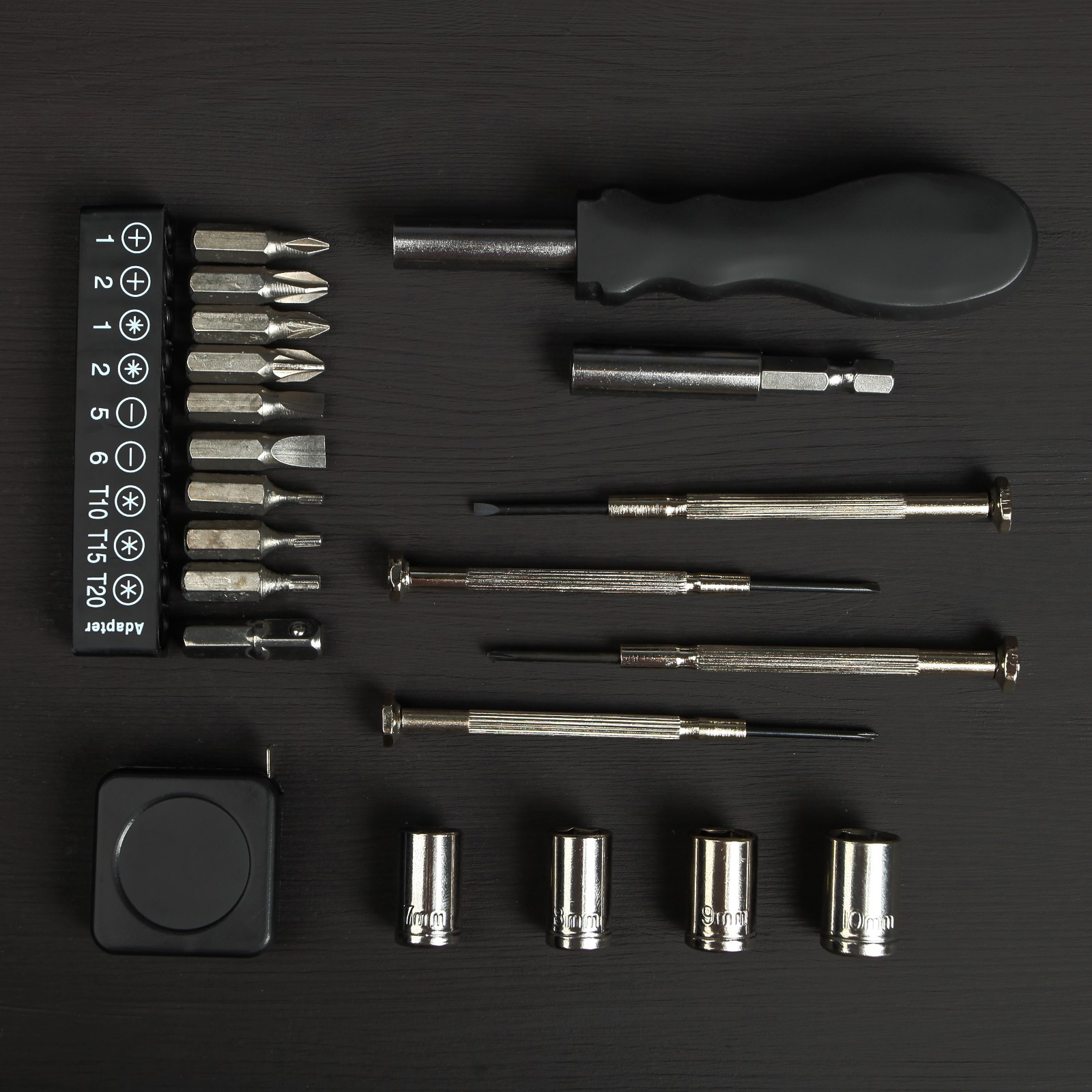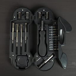 Возникли неполадки в пути? Нужно быстро исправить проблему? Откройте багажник и достаньте этот комплект. Там есть всё необходимое для современного водителя: отвёртки, набор бит (насадок), торцевые головки и рулетка. Также в комплект входит фонарь, чтобы вы смогли работать даже в темноте.