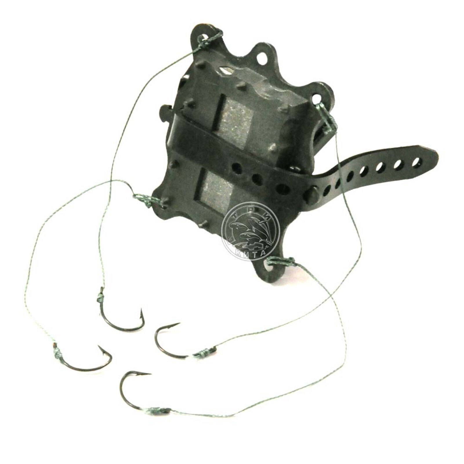Снасть для ловли на жмых. Состоит из петли с самозатягивающим узлом ,небольшим скользящим грузилом ограниченное двумя стопорами и 4 крючками №6-8 на капроновых повоках крепящихся за петлю +макуха.
