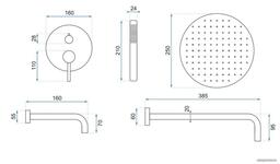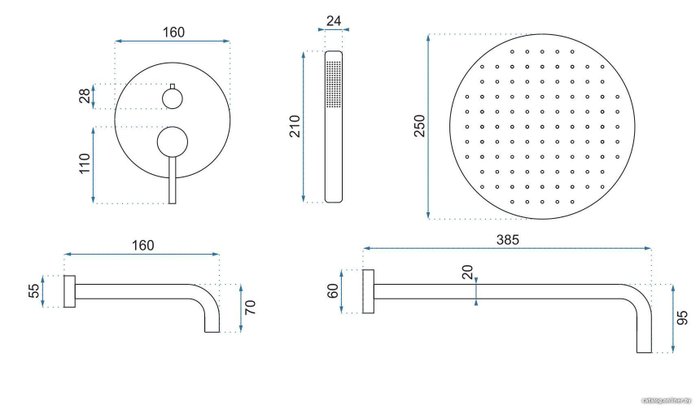• Комплектация верхний душ, ручной душ (лейка), держатель лейки, шланг, смеситель, излив для ванны
