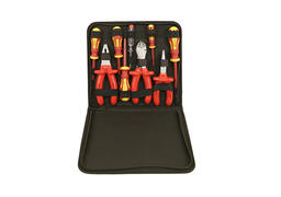 Набор диэлектрического инструмента 9 предметов оптимально подходит для выполнения различных монтажных, ремонтных и строительных работ внутри помещения или на открытом воздухе. В комплект включены пассатижи, длинногубцы, бокорезы и шесть отверток, одна из которых со встроенным индикатором.Отличительные особенности модели:• металлическая рабочая поверхность, устойчивая к повреждениям;• работа под напряжением до 1000 В;• изолирующие рукоятки с антискользящим покрытием;• кейс для хранения и транспортировки.