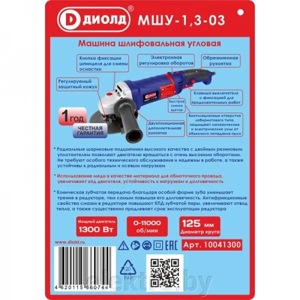 ДИОЛД МШУ-1,3-03 машина шлифовальная угловая, 220В/50Гц, 1300 Вт, 0-11000 об/мин