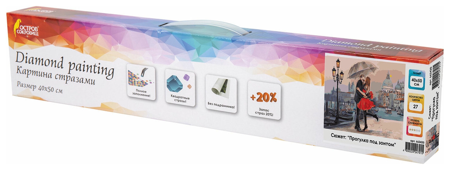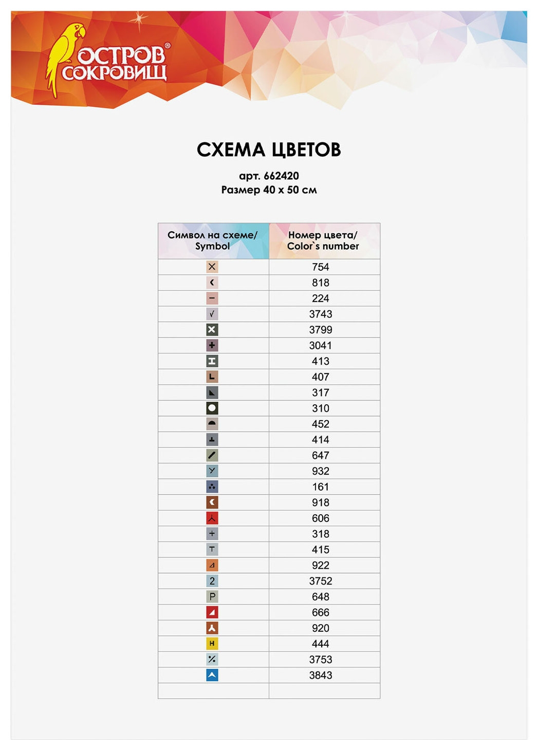- схема соответствия цветов страз и символов на холсте. Размер готовой картины составляет 40х50 см. Картина полностью заполняется квадратными акриловыми стразами, благодаря чему готовая работа блистает и переливается на свету. Техника алмазной мозаики проста в исполнении и не требует владения никакими специальными навыками. Все необходимые для работы материалы и инструменты входят в набор. С подробной инструкцией можно ознакомиться на упаковке. Товар высокого качества с детально проработанной схемой и надёжным клеевым слоем, но при этом относится к среднему ценовому сегменту.