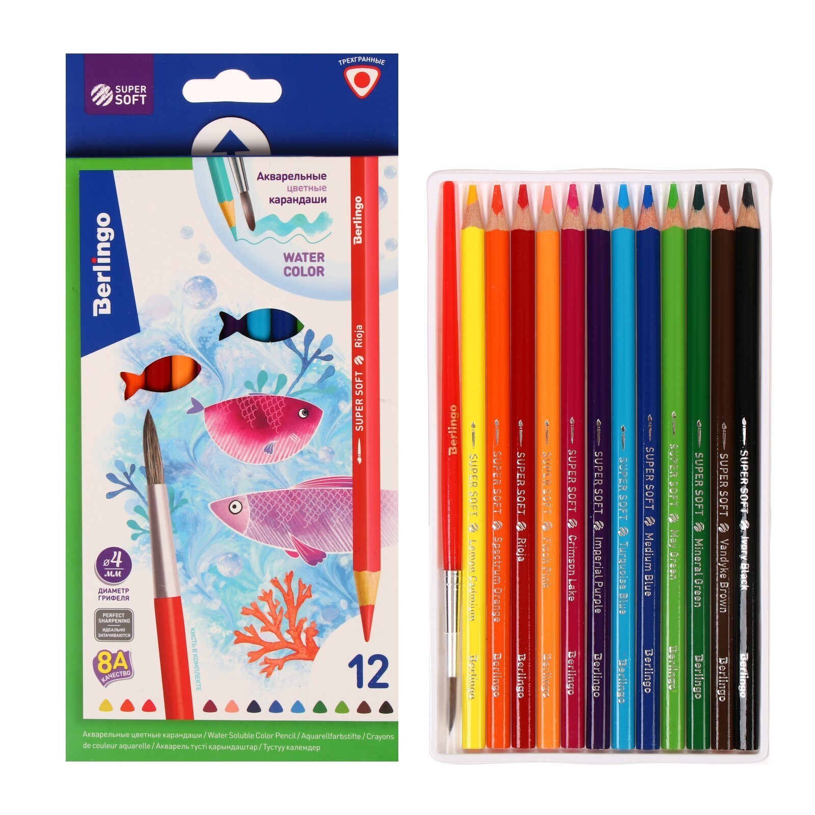 Карандаши акварельные 12 цветов "Рыбки",трехгранные, с кистью