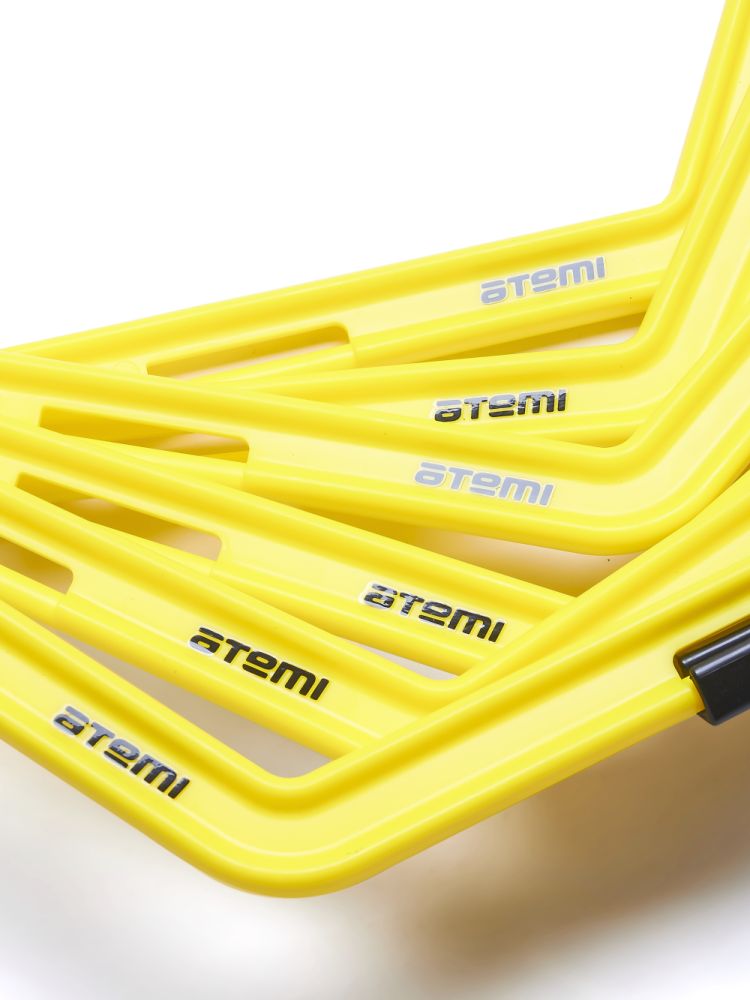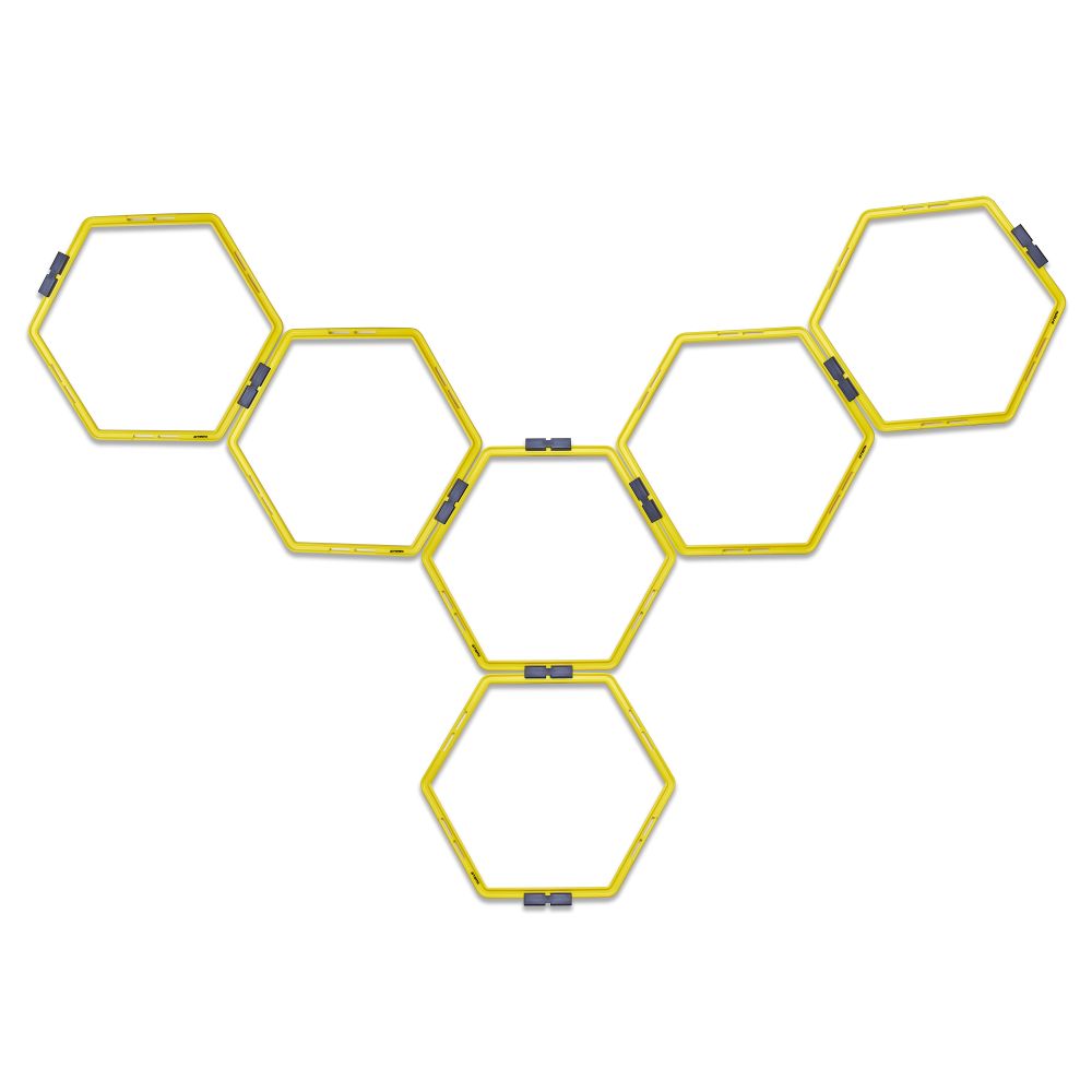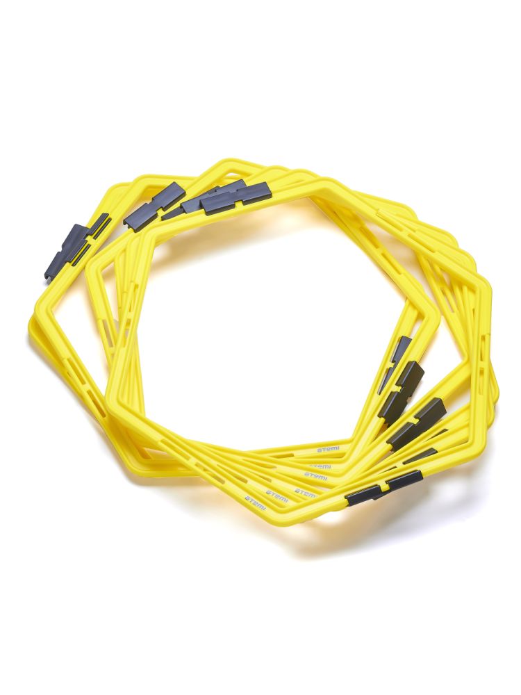 Набор из 6 шестигранных колец ATEMI, артикул AAR-001-SET. Предназначен для тренировок на ловкость, координацию и точность движений. В комплект входят 12 зажимов для соединения колец в различные схемы. Яркий цвет обеспечивает хорошую видимость на поле. Набор упакован в текстильную сумку с логотипом ATEMI. Материал: полипропилен. Цвет: желтый