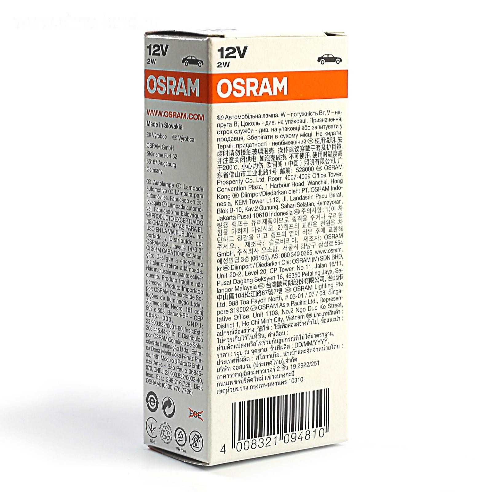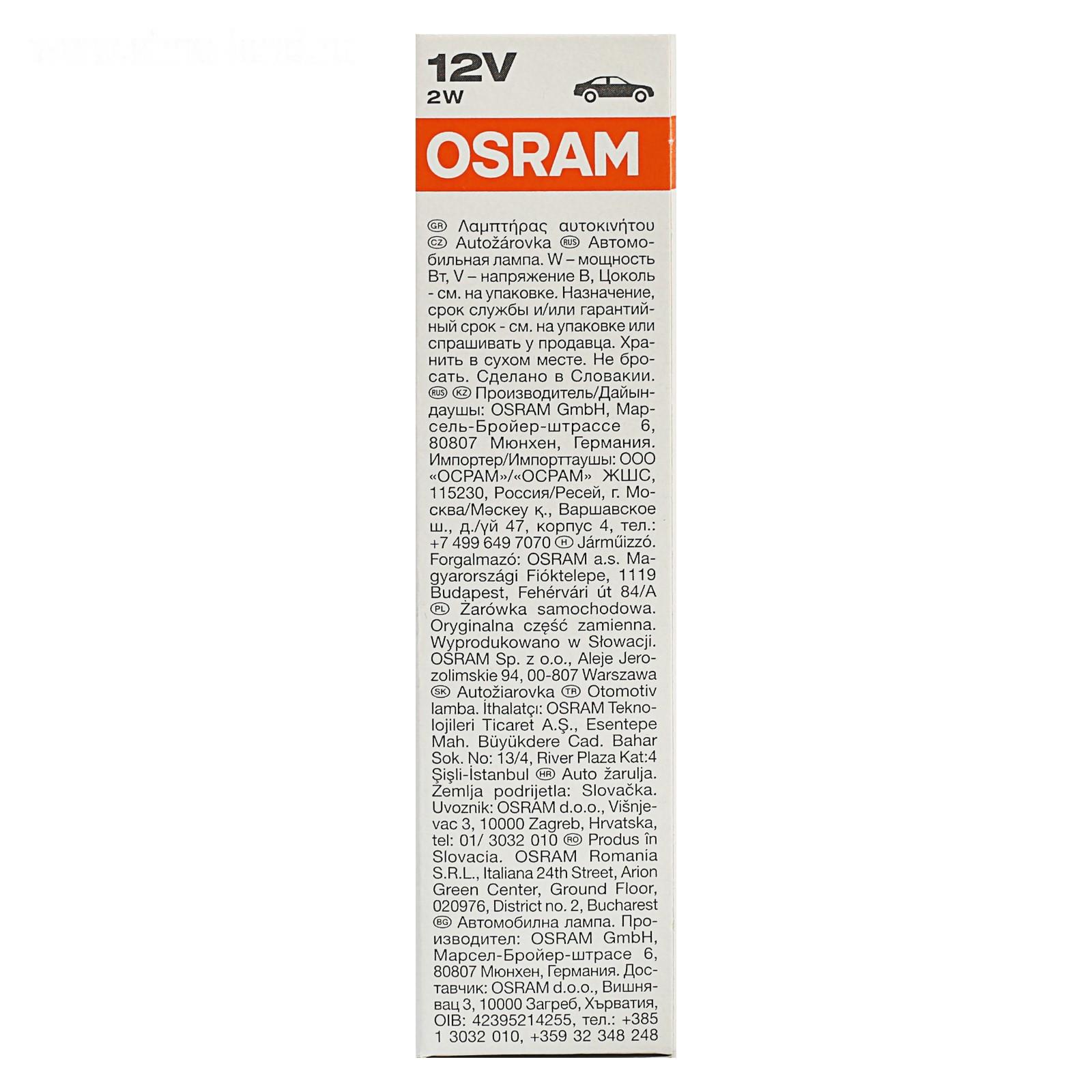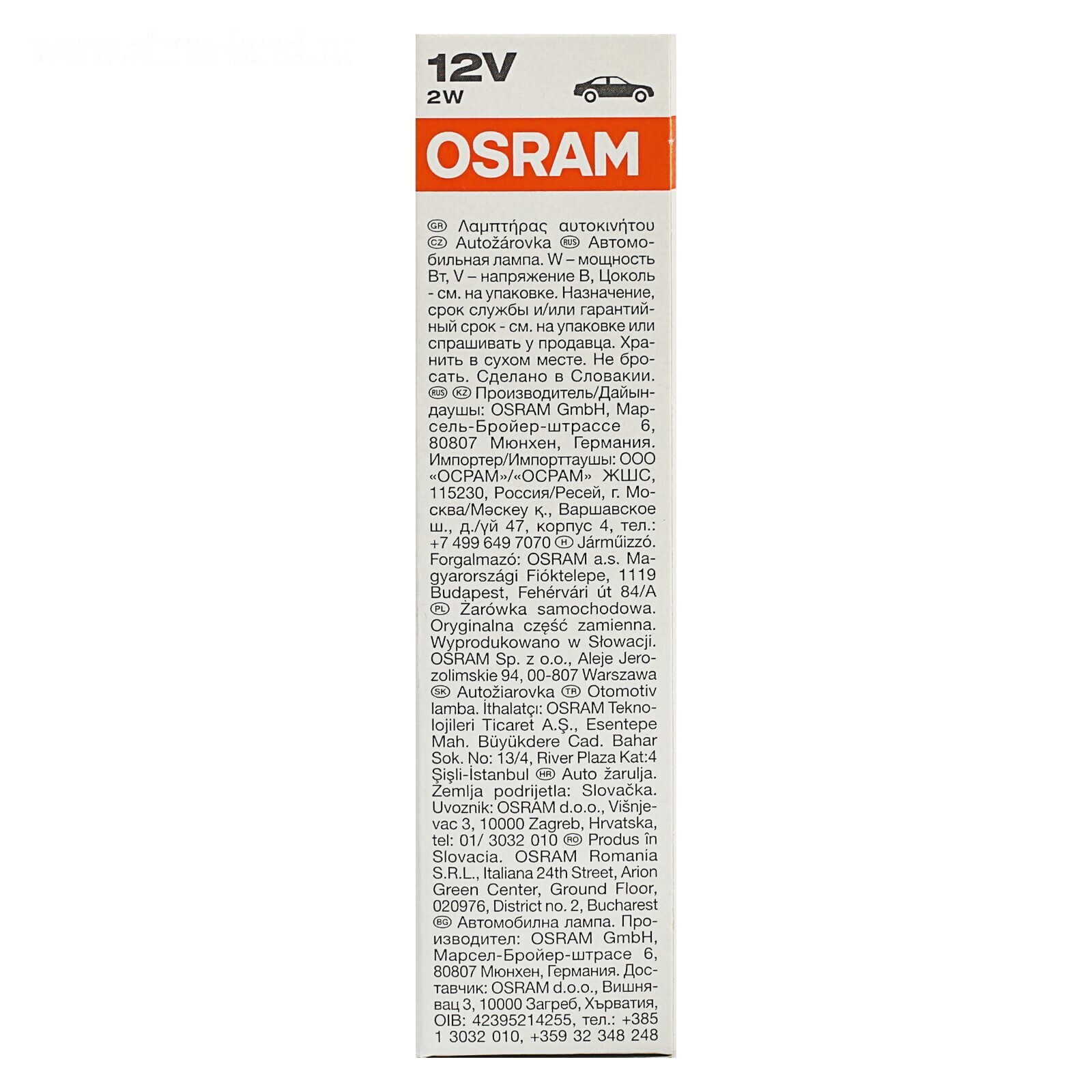 Лампа автомобильная Osram, W2W, 12В, 2 Вт, W2x4.6d