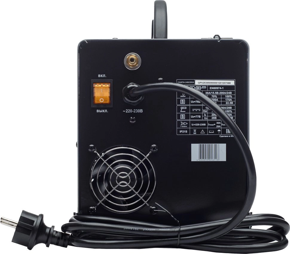 • Комплектация Сварочный аппарат, кабель с горелкой, кабель заземления, наконечники, паспорт, упаковка.