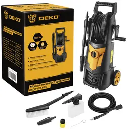КомплектацияМойка высокого давления DEKO DKCW170 PRO, пистолет, шланг высокого давления, насадка-распылитель, насадка-щётка, емкость для моющих средств.