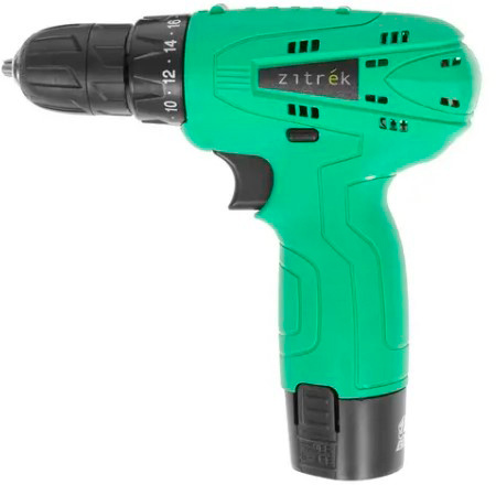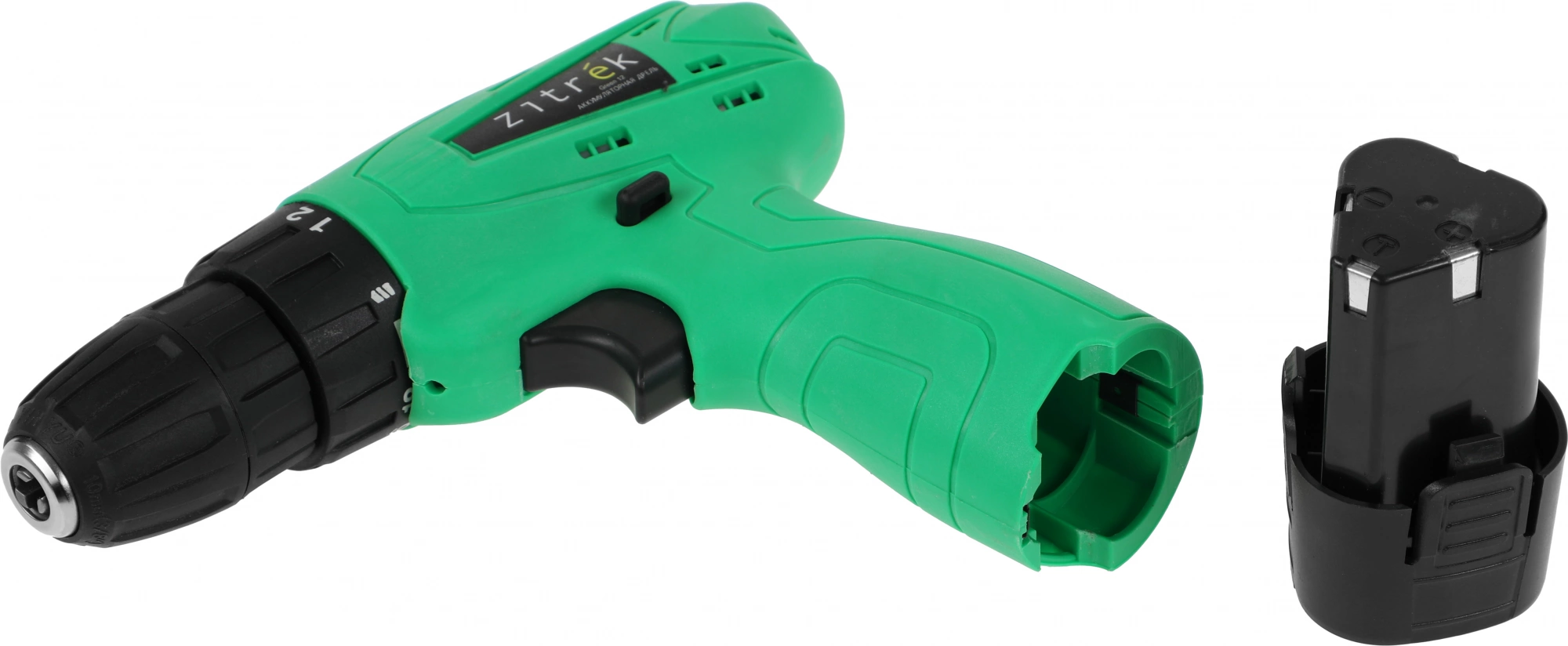 Комплект поставкиДрель-шуруповерт аккумуляторная Zitrek Green 12, литиевый аккумулятор 1,5 Ач, двухсторонняя бита, зарядное устройство, руководство по эксплуатации.