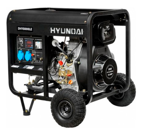ОсобенностиДвигатель HYUNDAI серии IC (industrial commercial). Электрозапуск 12 volt. Выключатель защиты при перегрузках. Аварийная остановка при низком уровне масла в картере. Увеличенный стальной топливный бак. Автоматический регулятор напряжения с защитой от КЗ. Транспортировочные колеса в комплекте.