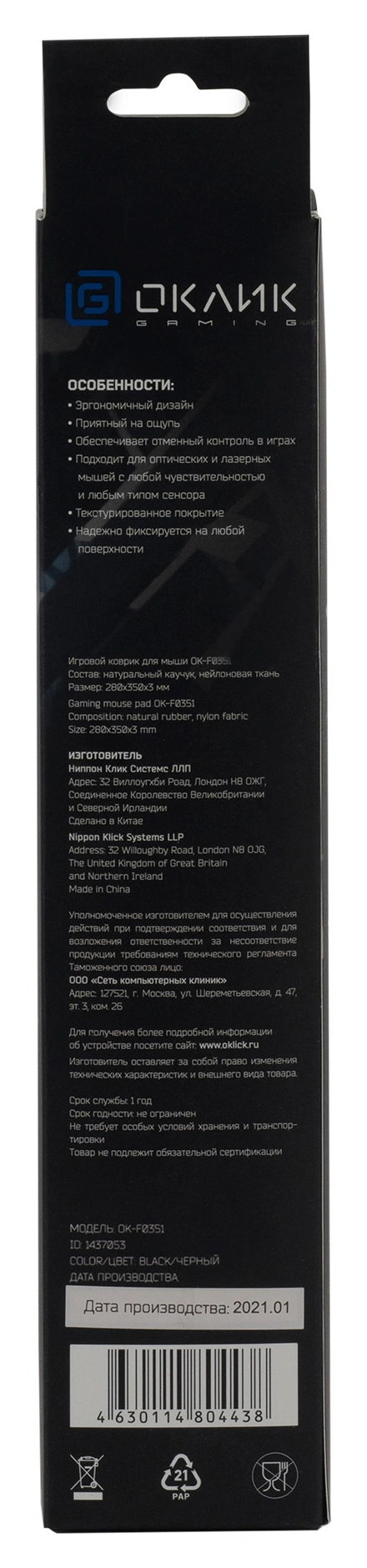 Коврик для мыши Оклик OK-F0351 Средний черный 350x280x3мм