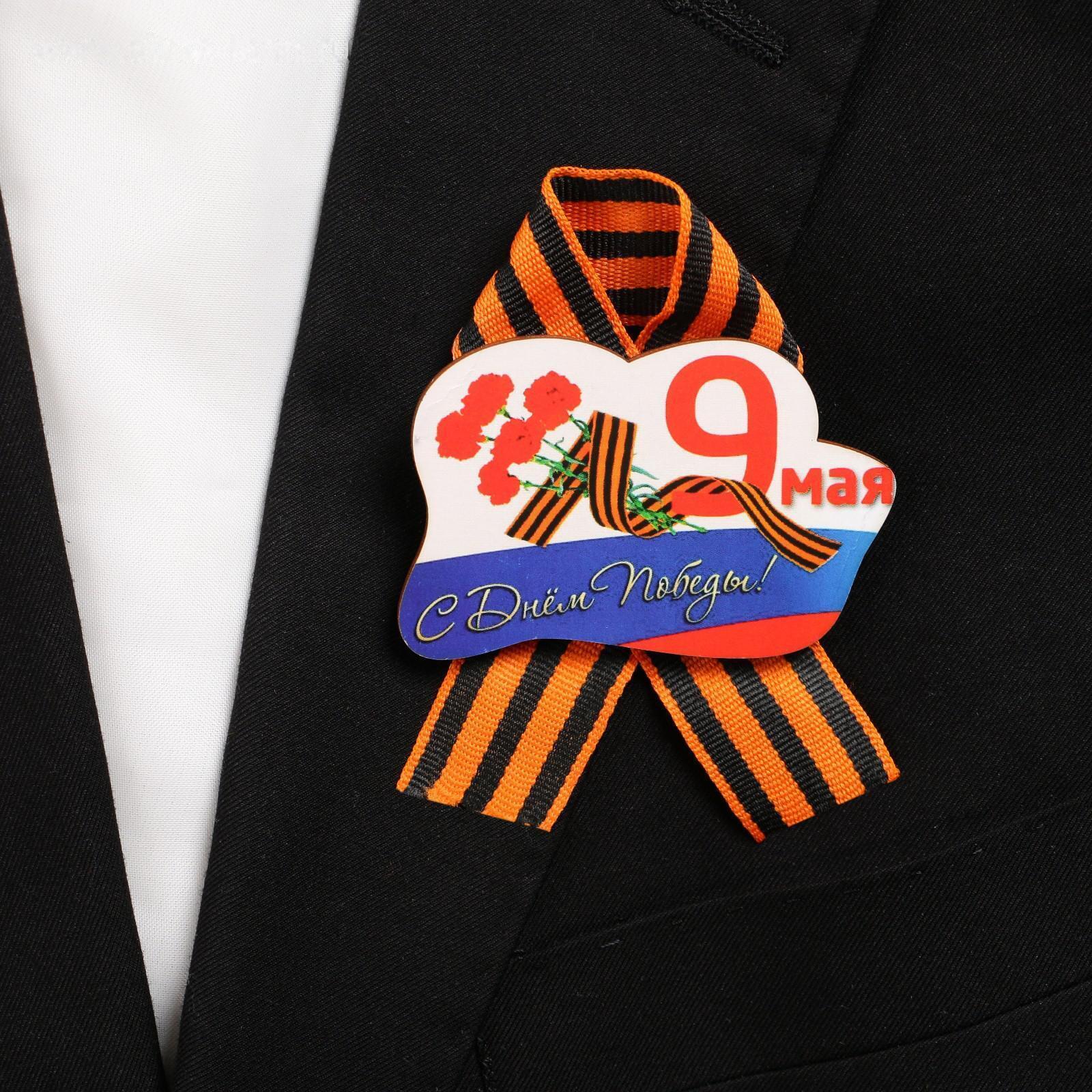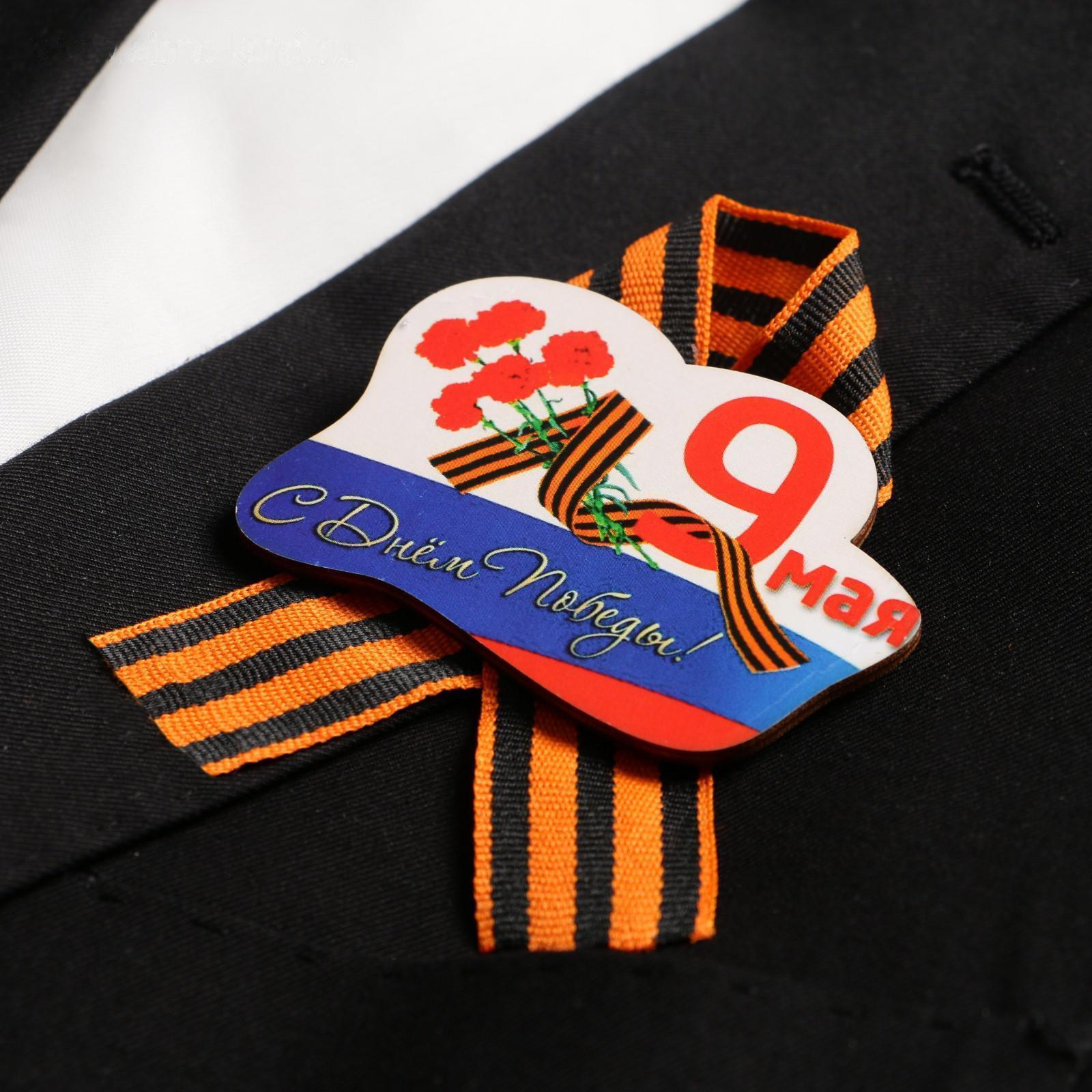 Значок деревянный с лентой "С Днём Победы!" гвоздики, триколор