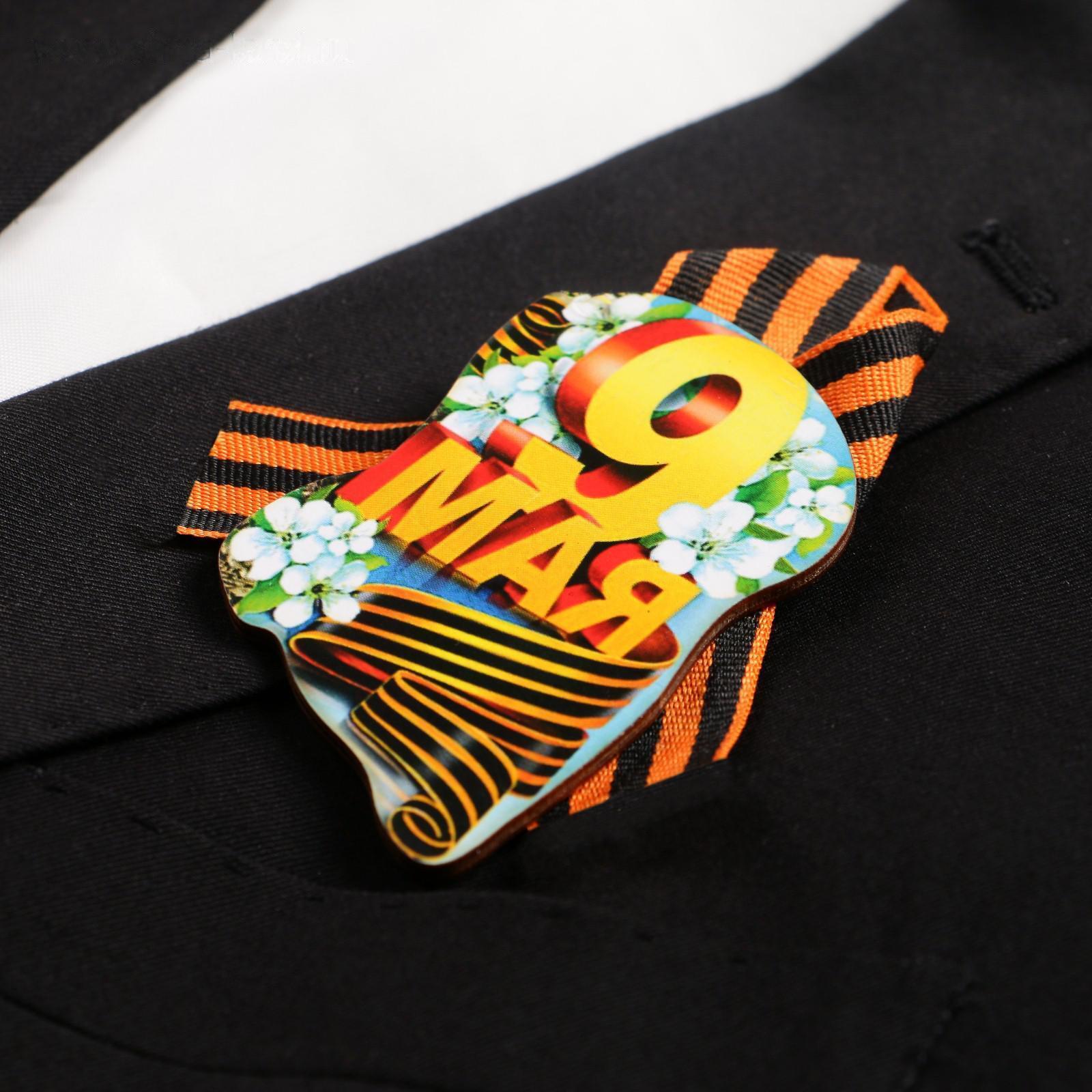 Значок деревянный с лентой "9 Мая" цветы яблони