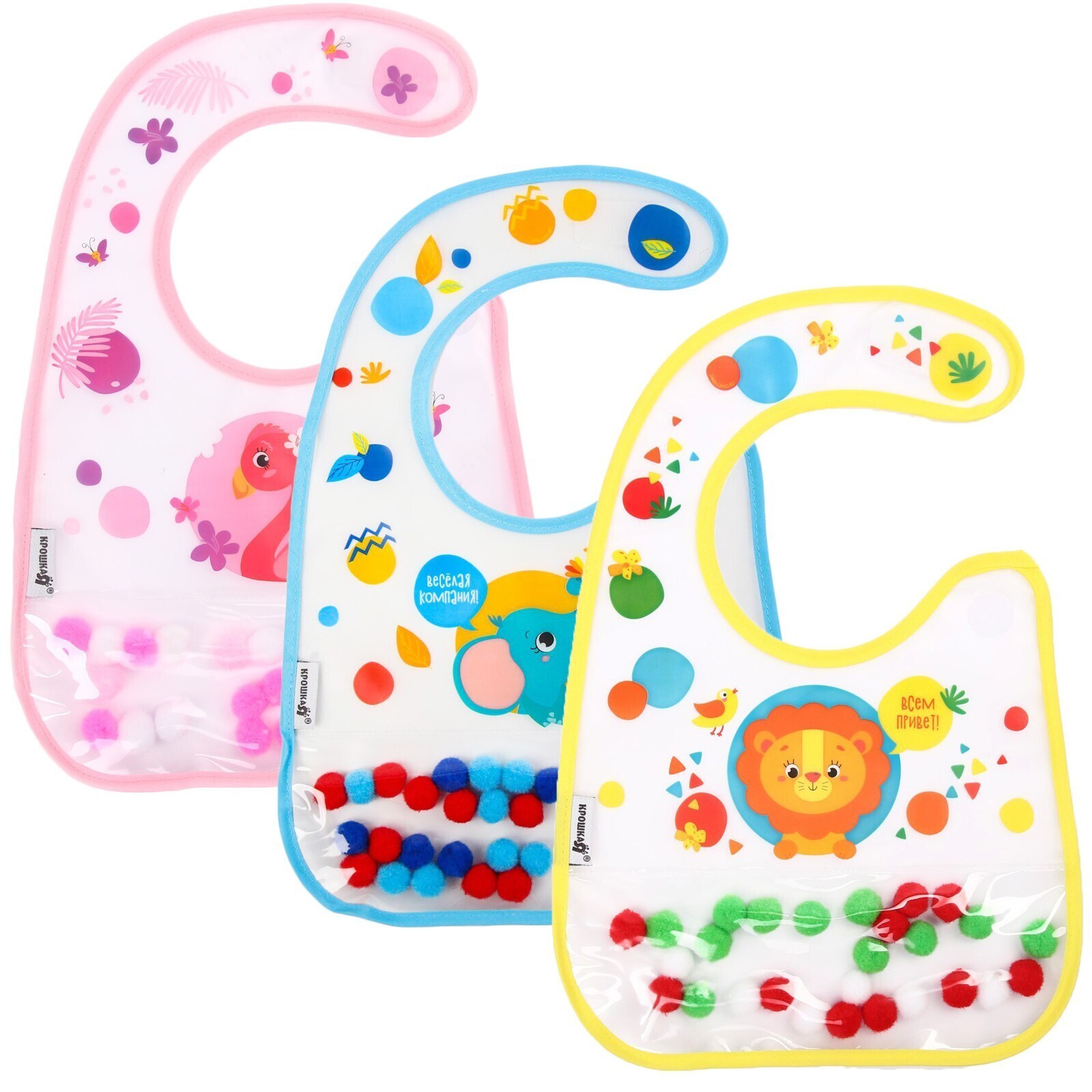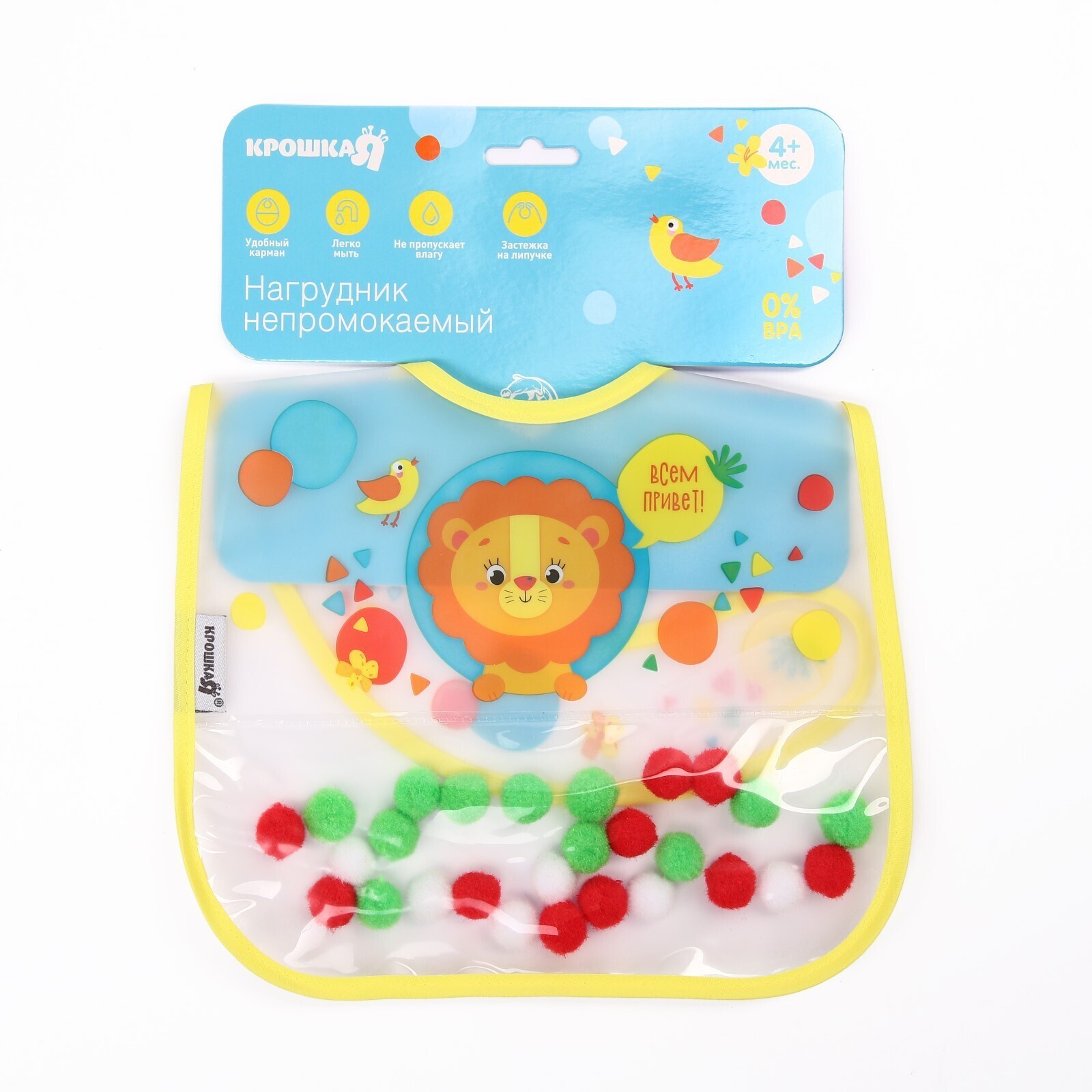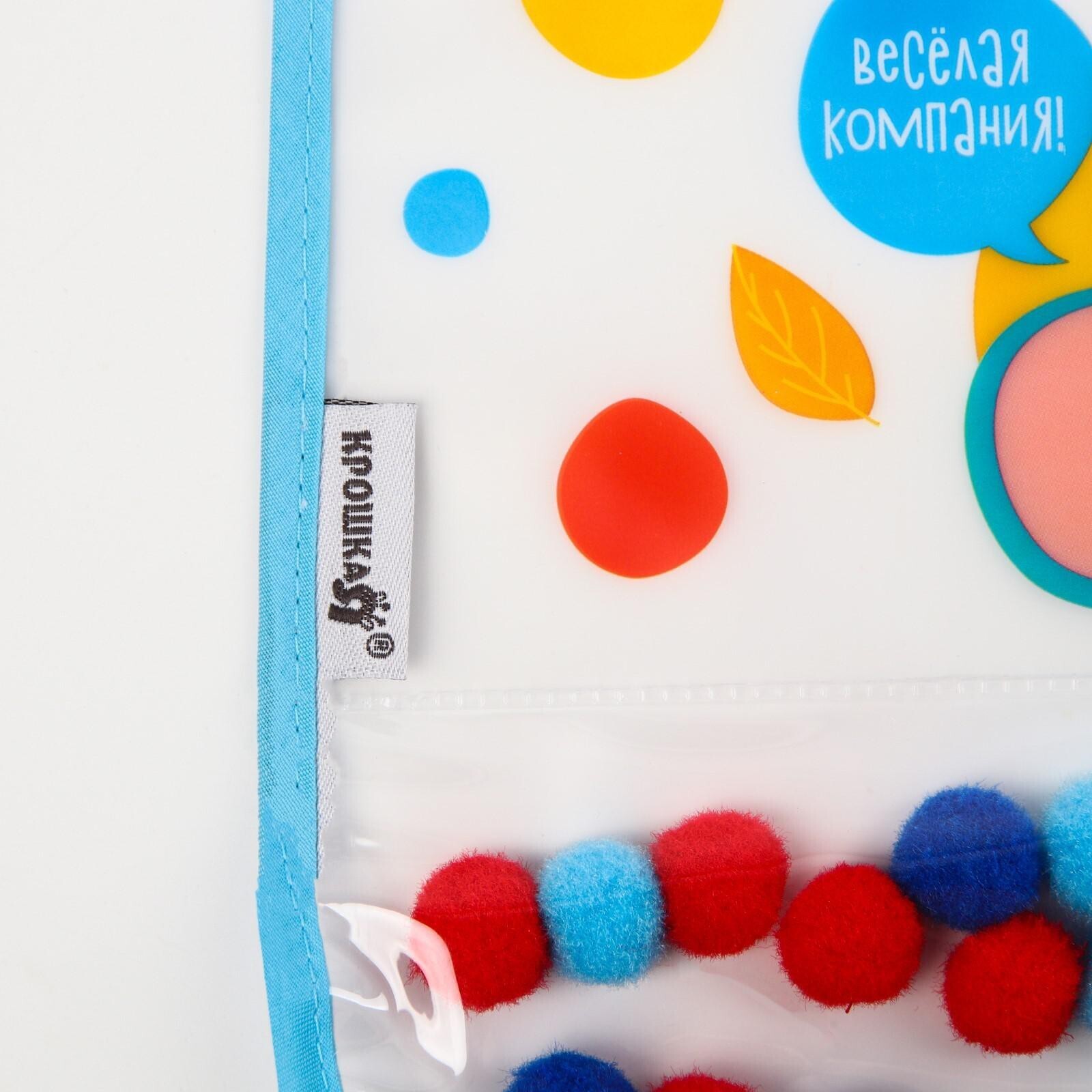 Нагрудник для кормления «Крошка - помпошка» непромокаемый на липучке, с помпошками, МИКС