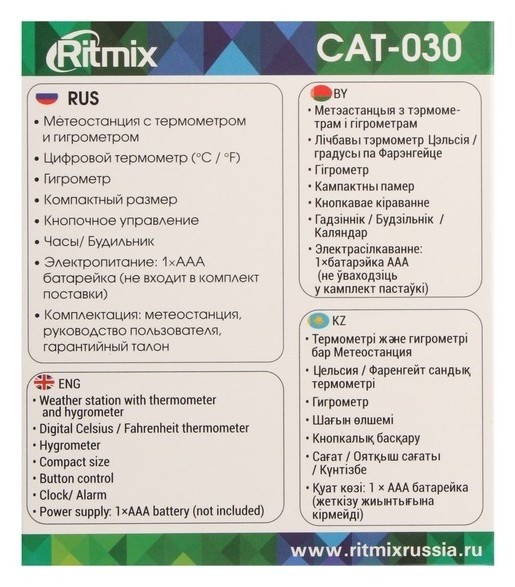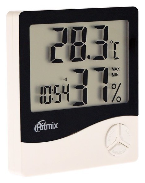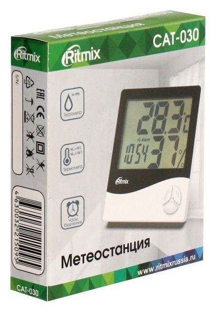 Метеостанция RITMIX CAT-030 предназначена для измерения температуры и влажности в помещении. Имеет компактный корпус и жидкокристаллический дисплей с большими цифрами. Работает от одной батарейки типа ААА, которой хватит на несколько месяцев.