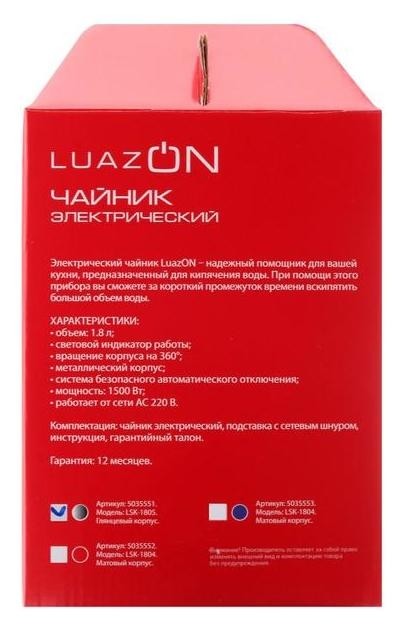 Чайник электрический Luazon Lsk-1805, 1500 Вт, 1.8 л, металл, серебристый
