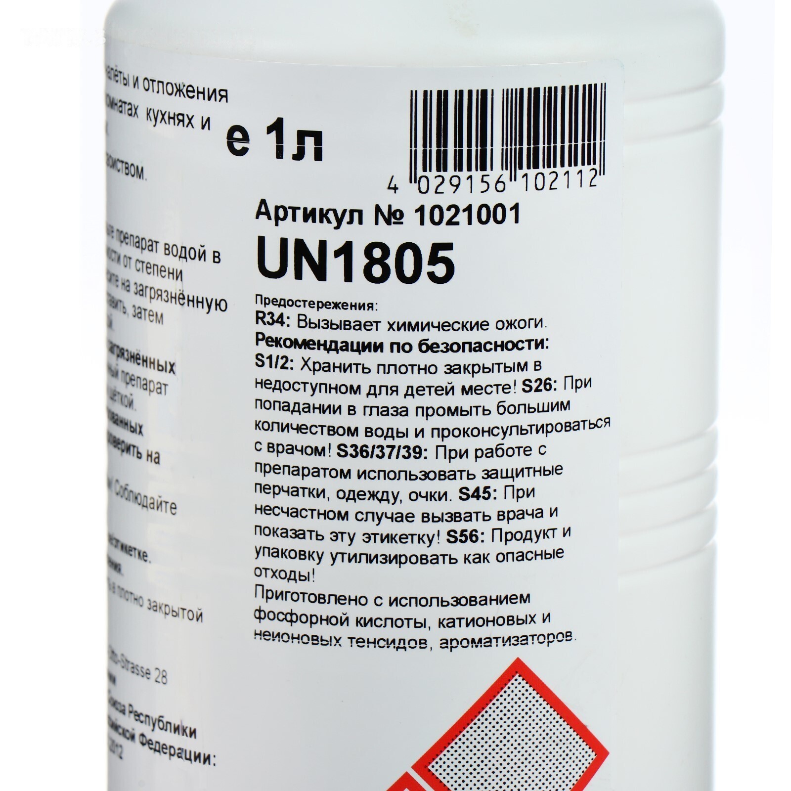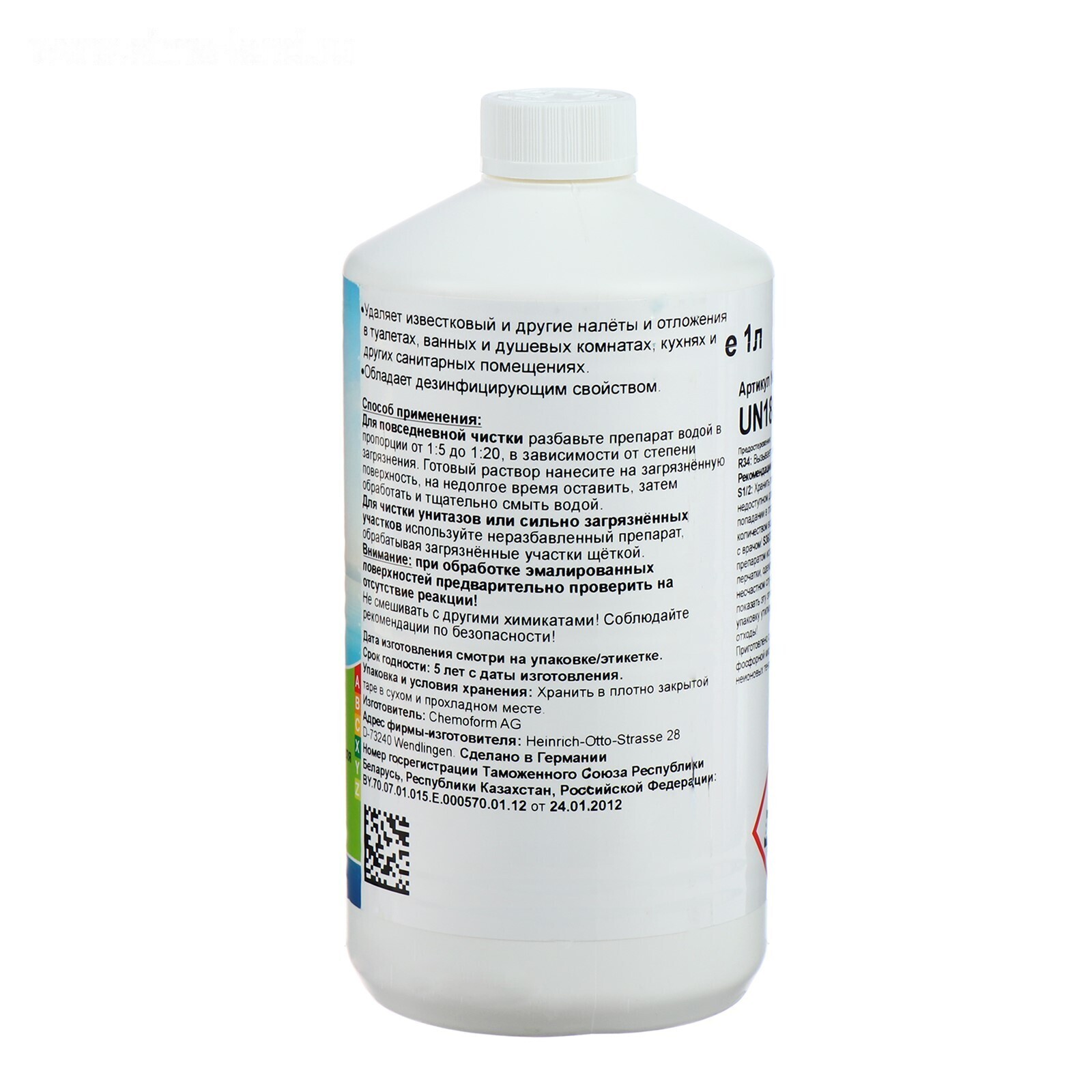 Применение: препарат удаляет образование извести и другие налеты в ванных, душевых комнатах, туалетах, а также кухнях.