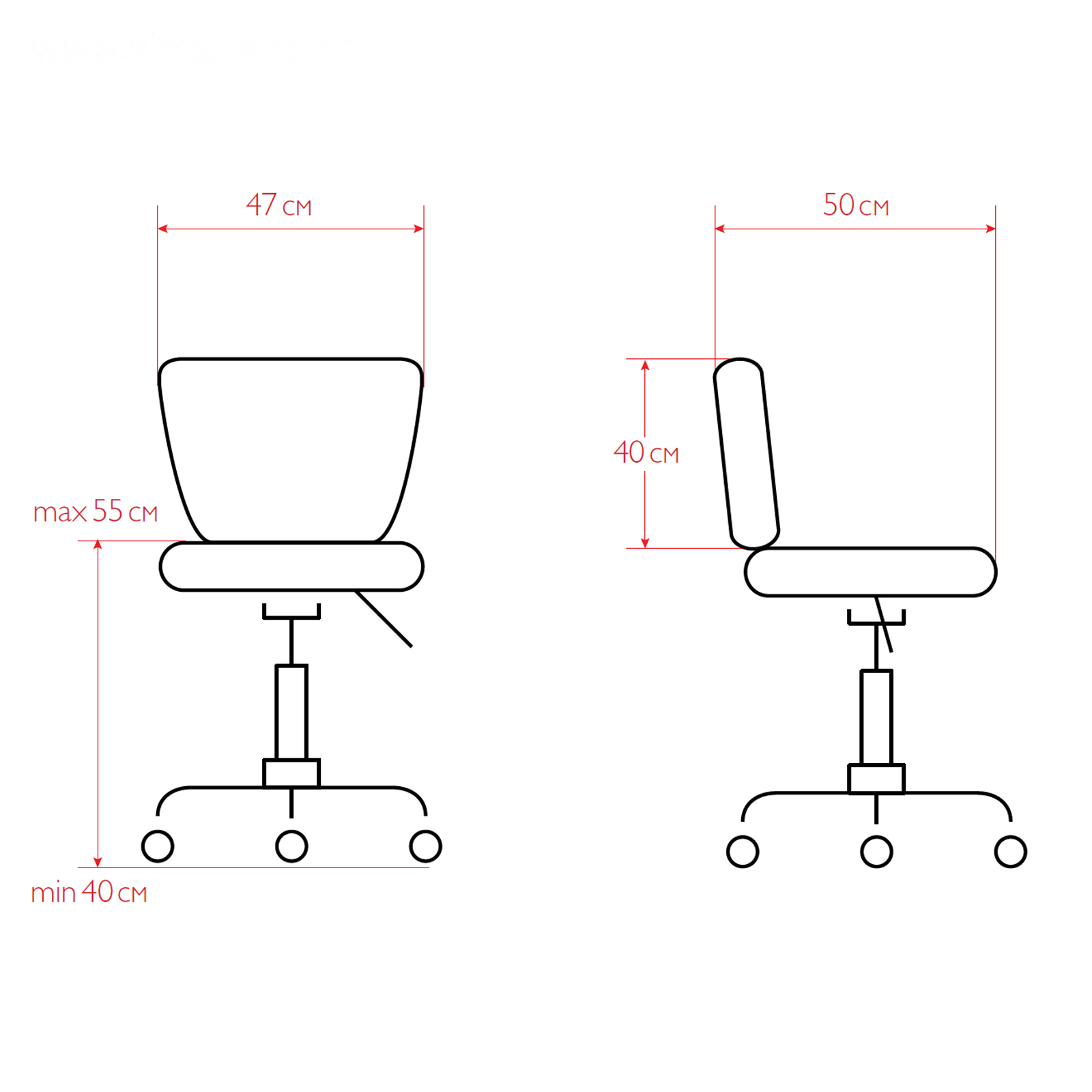 Стул оригинального дизайна с пневматической регулировкой высоты. С удобным мягким сиденьем. Колесики вращаются на 360°.