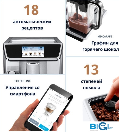 • Программы приготовления эспрессо, лунго, капучино, латте макиато, флэт уайт, латте, горячий шоколад