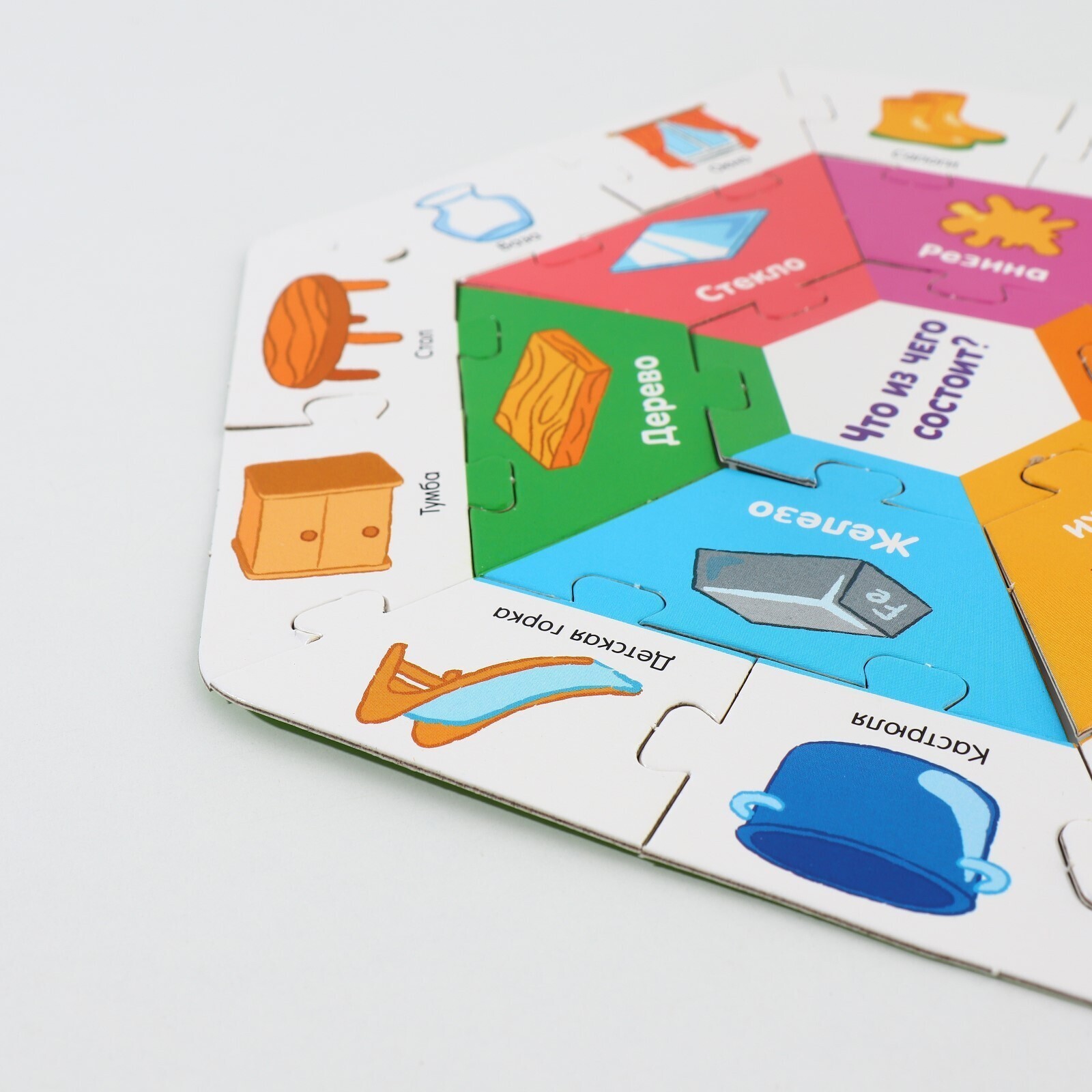 Перед вами игра, которая познакомит ребёнка с предметами и материалами, из которых они состоят, а также с продуктами питания. Собирайте большой пазл, тренируйте мелкую моторику и узнавайте, что из чего состоит.