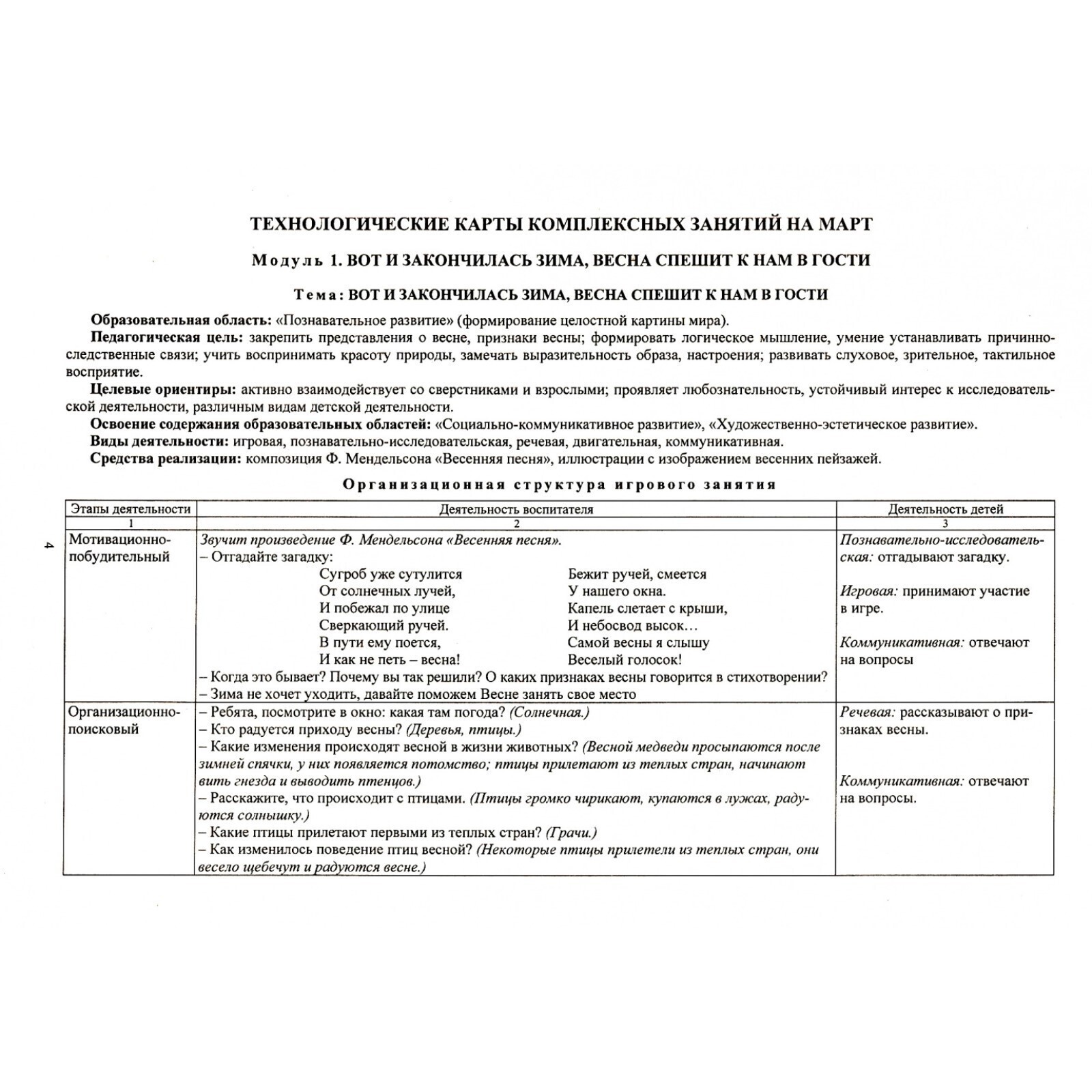 Каждая технологическая карта содержит комплекс действий на уровне воспитателя по сопровождению деятельности детей и действий на уровне ребёнка по освоению содержания всех образовательных областей. Удобное табличное размещение материала позволяет педагогу обеспечить целостность, системность и эффективность всех направлений развития дошкольников, опираясь на целевые ориентиры дошкольного образования по формированию предпосылок образовательной деятельности.
