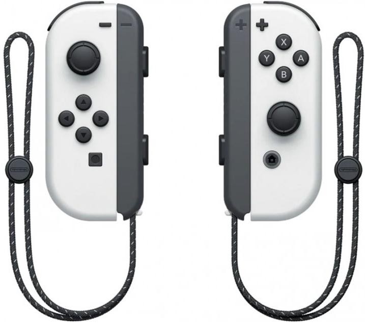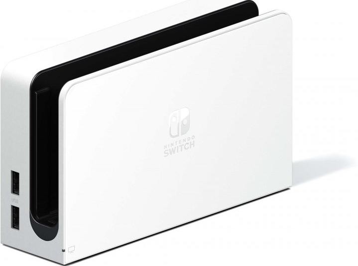 Консоль Nintendo Switch — OLED модель доступна в білому кольорі з білими контролерами Joy-Con, чорним основним блоком та білою док-станцією.