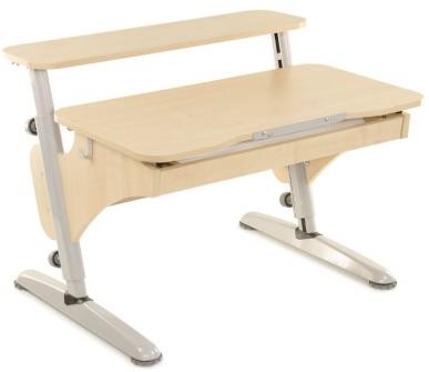 Парта оснащена ящиком для канцтоваров, на телескопических наплавляющих, крючком для рюкзака и упором для тетрадей. Выполнена на прочной металлической раме с деталями из высококачественного ЛДСП.