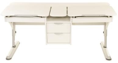 Парта оснащена підвісною тумбою, з 2 ящиками, ящиками для канцтоварів, на телескопічних наплавляючих, потайною полицею, гачками для рюкзака і упорами для зошитів. Виконана на міцній металевій рамі з деталями з високоякісного ЛДСП.