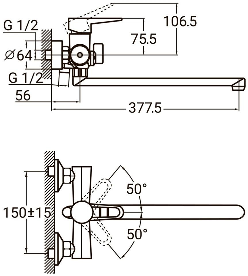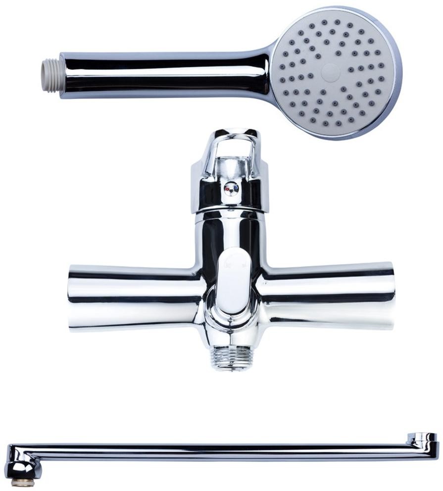 Смеситель комплектуется однорежимной ручной лейкой с настенным держателем и душевым шлангом длиной 150 см в металлической оплетке.