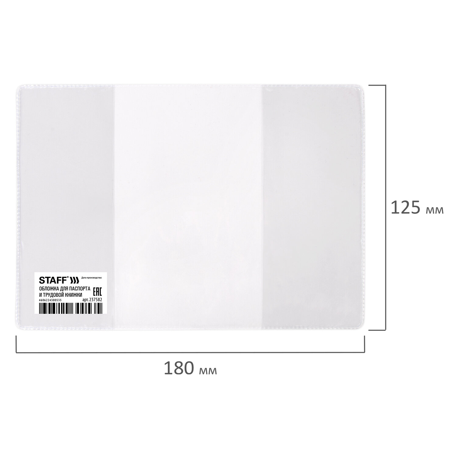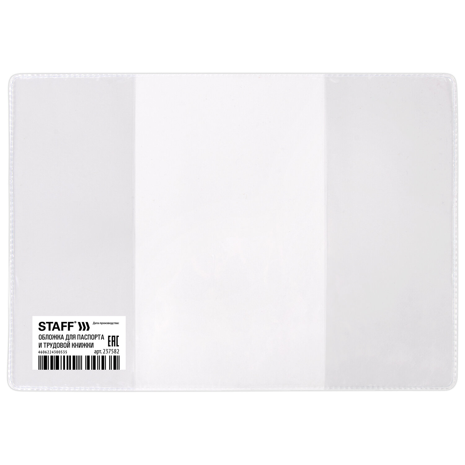 Описание товара 237582, (цена за 100 шт.) Обложка для паспорта и трудовой книжки, 90х125 мм, ПВХ, прозрачная, STAFF, 237582