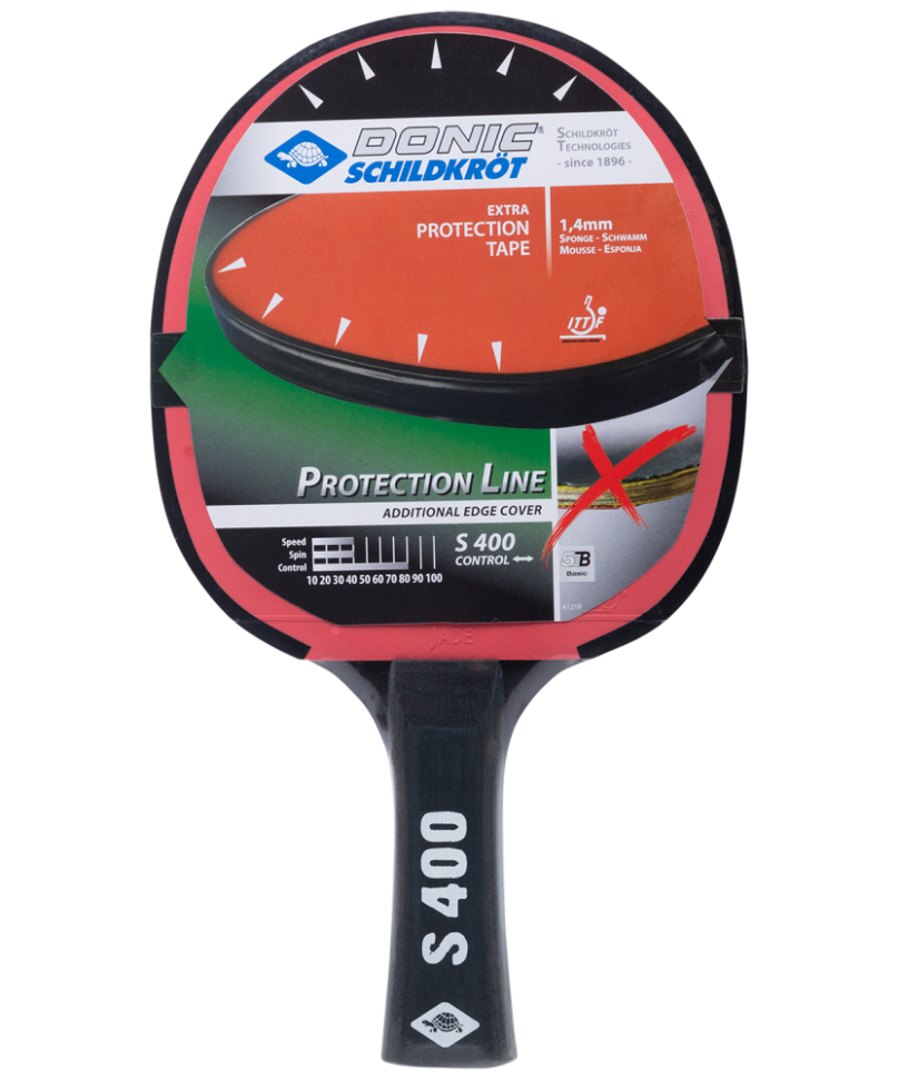 Ракетка Protection Line Level 400 от всемирно известного немецкого бренда Donic-Schildkrot является одной из самых интересных разработок за последнее время в мире настольного тенниса. Кромочная лента защищает дерево и резину от повреждений, что значительно увеличивает срок службы ракетки. Высокий показатель контроля гарантирует уверенную игру для новичка. Характеристики: Форма ручки: коническая Скорость: 30 Вращение: 40 Контроль: 80 Материал основания: дерево Количество слоев основания: 5 Толщина губки: 1,2 мм Накладка: Jade ITTF Тип игры: Control