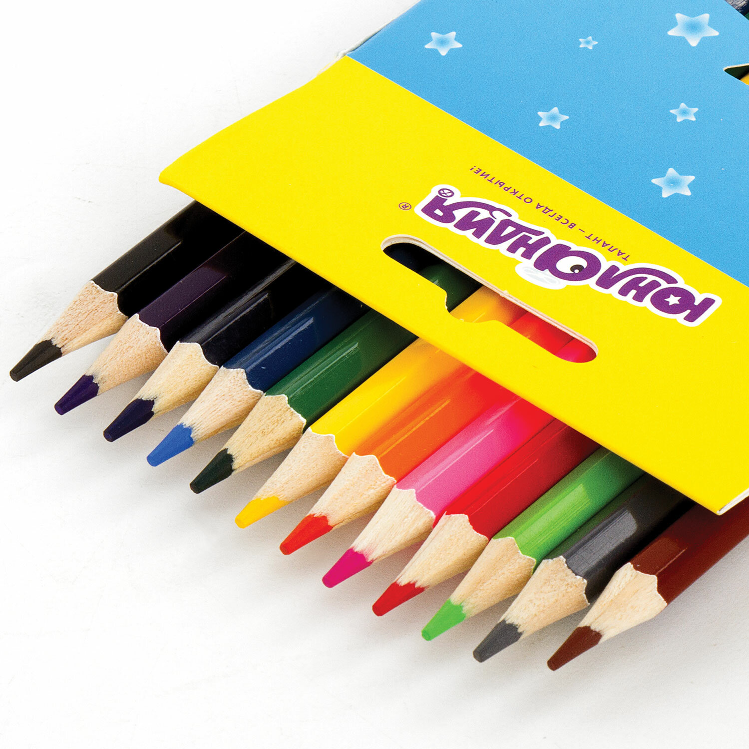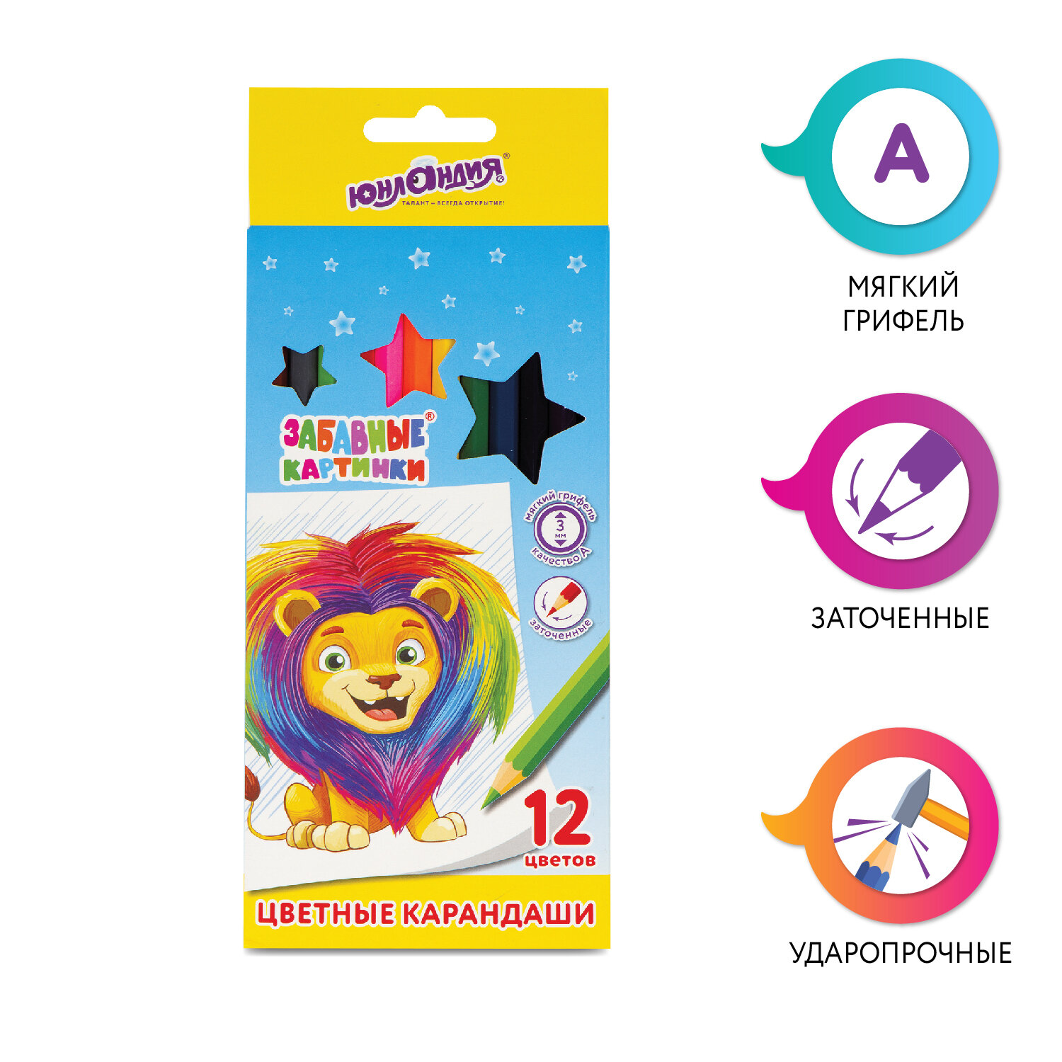 181643, Карандаши цветные мягкие ЮНЛАНДИЯ "ЗАБАВНЫЕ КАРТИНКИ", 12 цветов, классические, заточенные, 181643
