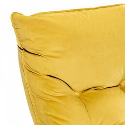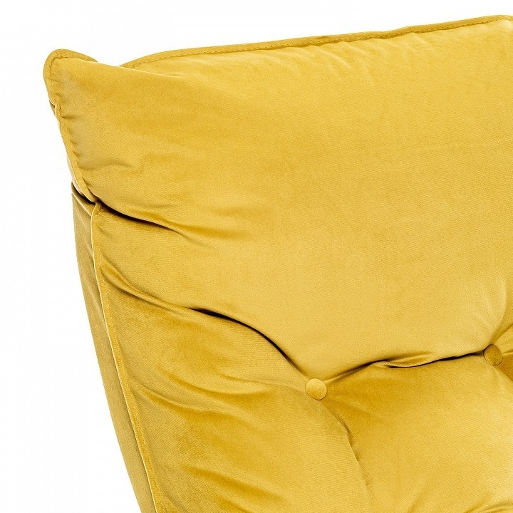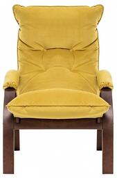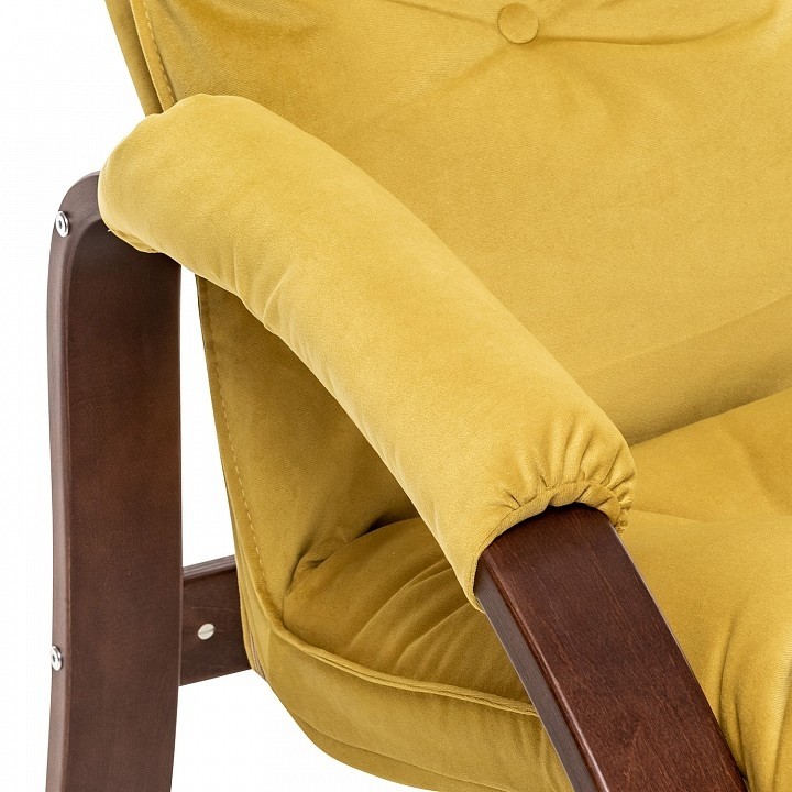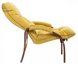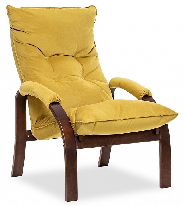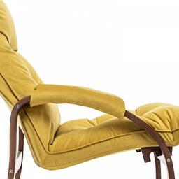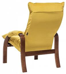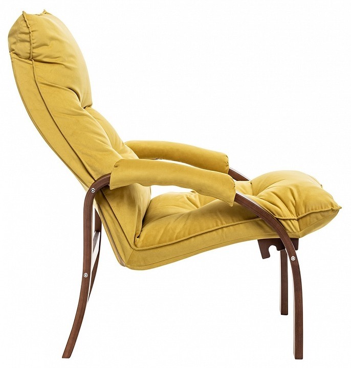 Цвет обивки: V28 желтый, Материал обивки: велюр, Наполнитель: ППУ, холкон, Материал покрытия корпуса: шпон, Материал корпуса: фанера ФСФ, шпон березовый гнутоклееный, Тип поверхности корпуса: полуматовый, Художественное описание товара: Мягкое кресло для отдыха дома и на даче Левада сделает комфортным интерьер комнаты модерн или хай-тек. Стильные кресла трансформеры из гнутоклееной коллекции мягкой мебели Leset имеют характерный силуэт, функциональны и компактны, поэтому популярны. Кресло-стул с подлокотниками и уютным сиденьем уместно в спальне, гостиной, прихожей, на балконе, в закрытой дачной беседке. У основания кресло раскладное оснащено механизмом гребенка, за счет чего одним движением спинка переключается в 2 положения: сидя или полулежа. Этим модель напоминает шезлонг, но Левада Leset -полноценное интерьерное кресло для отдыха: современный дизайн, изящный деревянный каркас под итальянским лаком, велюровый чехол, наполнитель из эластичного пенополиуретана. Накладки на подлокотниках снимаются для чистки, приспинная подушка декорирована пуговицами. Эргономичное каркасное кресло раскладушка выдержит до 120 кг. Регулируемое кресло позволит расслабиться как на диване, это чудесный подарок в новую квартиру друзьям., Дополнительные параметры: Углы наклона спинки - 115°, 123°. Высота от пола до сиденья (верхняя точка) - 450 мм. Толщина сиденья - 100 мм. Съемные подлокотники на липучке., Цвет корпуса: орех текстура, Основной цвет мебели: желтый