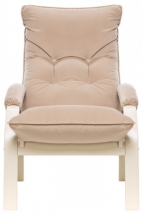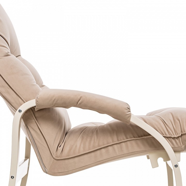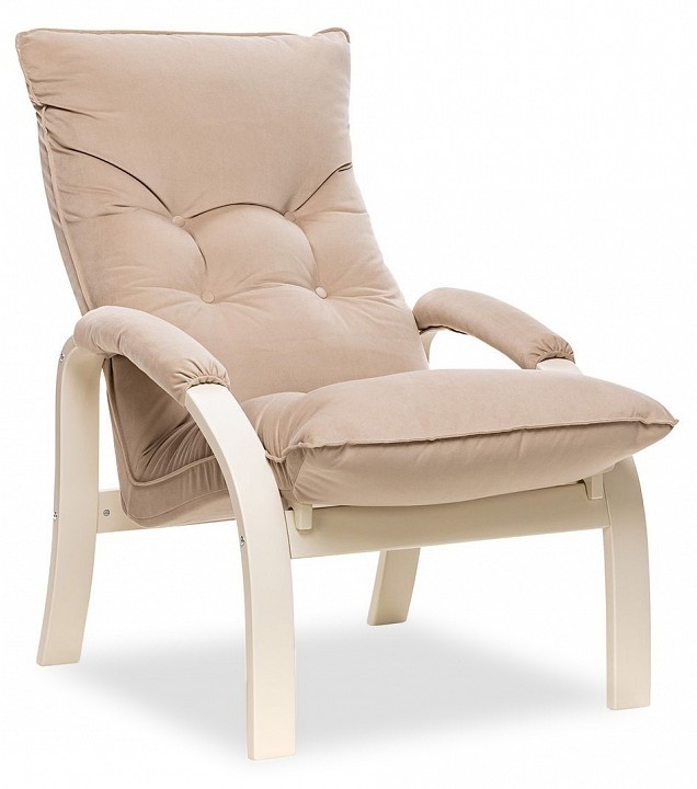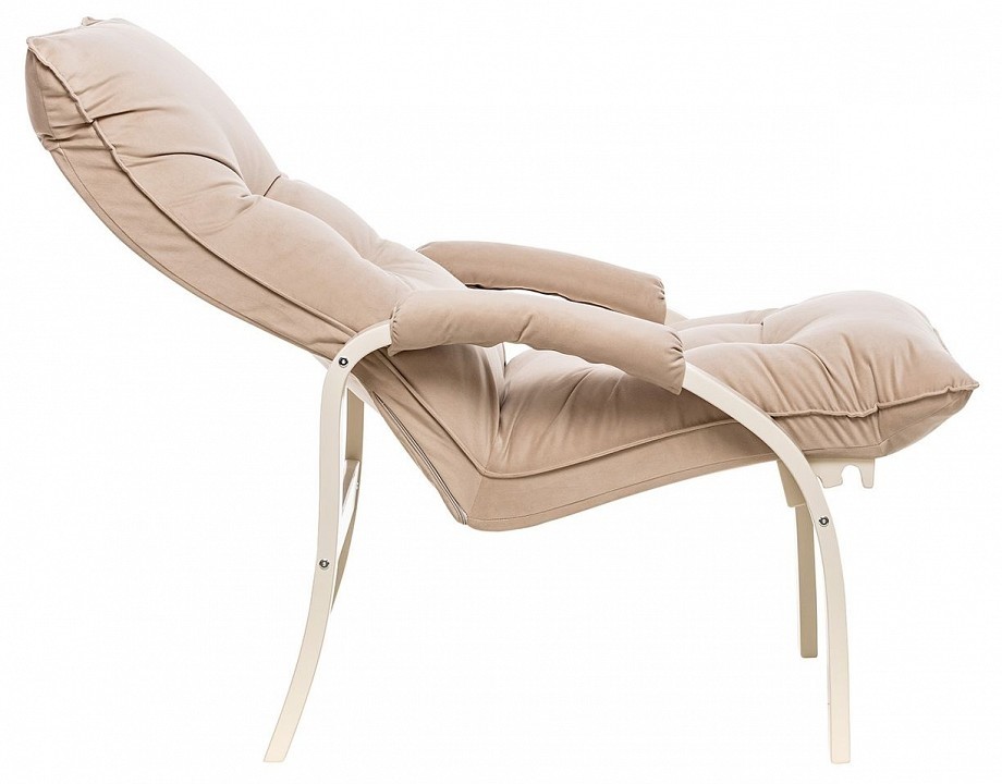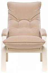 Цвет обивки: бежевый V18, Материал обивки: велюр, Наполнитель: ППУ, холкон, Материал покрытия корпуса: шпон, Материал корпуса: фанера гнутоклееная, Тип поверхности корпуса: полуматовый, Художественное описание товара: Мягкое кресло для отдыха дома и на даче Левада сделает комфортным интерьер комнаты модерн или хай-тек. Стильные кресла трансформеры из гнутоклееной коллекции мягкой мебели Leset имеют характерный силуэт, функциональны и компактны, поэтому популярны. Кресло-стул с подлокотниками и уютным сиденьем уместно в спальне, гостиной, прихожей, на балконе, в закрытой дачной беседке. У основания кресло раскладное оснащено механизмом гребенка, за счет чего одним движением спинка переключается в 2 положения: сидя или полулежа. Этим модель напоминает шезлонг, но Левада Leset -полноценное интерьерное кресло для отдыха: современный дизайн, изящный деревянный каркас под итальянским лаком, велюровый чехол, наполнитель из эластичного пенополиуретана. Накладки на подлокотниках снимаются для чистки, приспинная подушка декорирована пуговицами. Эргономичное каркасное кресло раскладушка выдержит до 120 кг. Регулируемое кресло позволит расслабиться как на диване, это чудесный подарок в новую квартиру друзьям., Дополнительные параметры: Углы наклона спинки - 115°, 123°. Высота от пола до сиденья (верхняя точка) - 450 мм. Толщина сиденья - 100 мм. Съемные подлокотники на липучке., Цвет корпуса: слоновая кость, Основной цвет мебели: бежевый