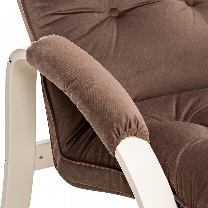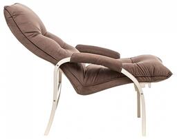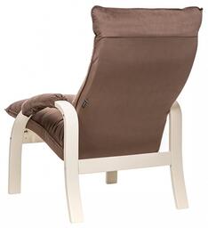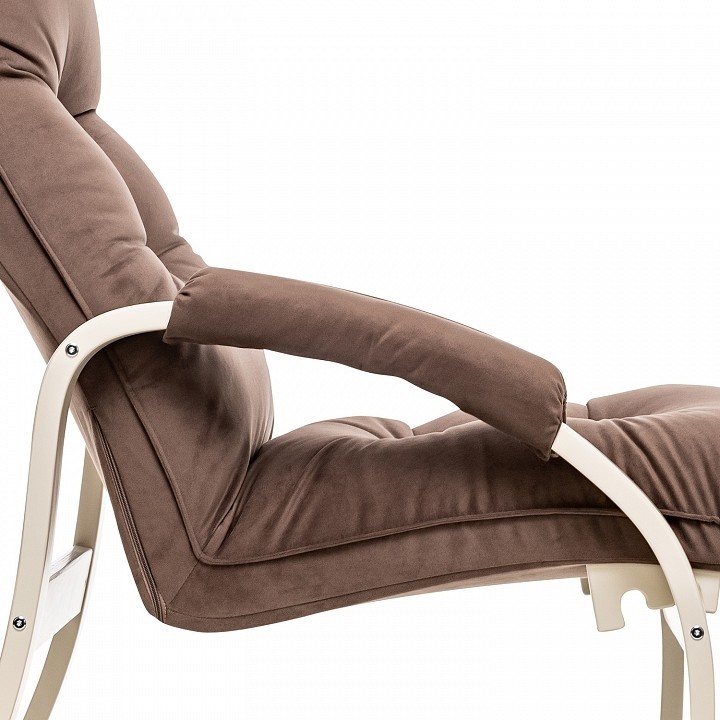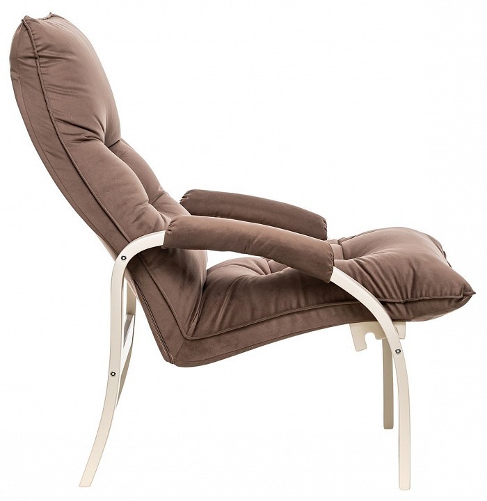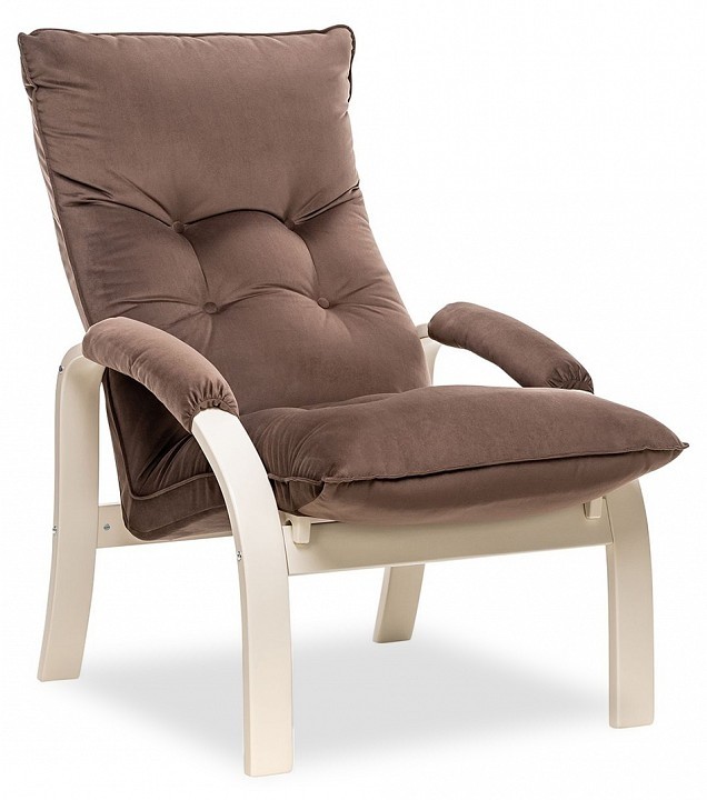 Цвет обивки: коричневый V23, Материал обивки: велюр, Наполнитель: ППУ, холкон, Материал покрытия корпуса: шпон, Материал корпуса: фанера гнутоклееная, Тип поверхности корпуса: полуматовый, Художественное описание товара: Мягкое кресло для отдыха дома и на даче Левада сделает комфортным интерьер комнаты модерн или хай-тек. Стильные кресла трансформеры из гнутоклееной коллекции мягкой мебели Leset имеют характерный силуэт, функциональны и компактны, поэтому популярны. Кресло-стул с подлокотниками и уютным сиденьем уместно в спальне, гостиной, прихожей, на балконе, в закрытой дачной беседке. У основания кресло раскладное оснащено механизмом гребенка, за счет чего одним движением спинка переключается в 2 положения: сидя или полулежа. Этим модель напоминает шезлонг, но Левада Leset -полноценное интерьерное кресло для отдыха: современный дизайн, изящный деревянный каркас под итальянским лаком, велюровый чехол, наполнитель из эластичного пенополиуретана. Накладки на подлокотниках снимаются для чистки, приспинная подушка декорирована пуговицами. Эргономичное каркасное кресло раскладушка выдержит до 120 кг. Регулируемое кресло позволит расслабиться как на диване, это чудесный подарок в новую квартиру друзьям., Дополнительные параметры: Углы наклона спинки - 115°, 123°. Высота от пола до сиденья (верхняя точка) - 450 мм. Толщина сиденья - 100 мм. Съемные подлокотники на липучке., Цвет корпуса: слоновая кость, Основной цвет мебели: коричневый
