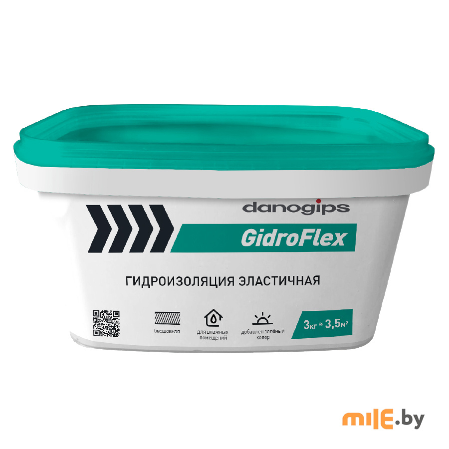 Danogips GidroFlex – готовая к применению бесшовная эластичная гидроизоляция для стеновых и напольных поверхностей во влажных и мокрых помещениях. После высыхания поверхность пригодна под укладку облицовочных материалов, таких как керамическая плитка, керамогранит и т.п. Предназначена для работы на объектах, подвергающихся нагрузке водой; для обработки гипсокартонных и гипсоволокнистых листов, цементных и гипсовых штукатурок, гипсовых пазогребневых плит, цементных и гипсовых стяжек, древесноволокнистых плит и ЦСП, пено- газобетонных блоков, бетонных и железобетонных поверхностей, полов с подогревом.