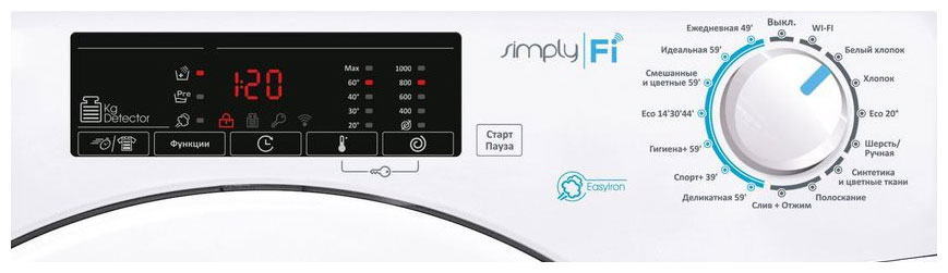 Candy Smart Pro оснащена новой технологией Simply-Fi, открывающей дополнительные и уникальные возможности для взаимодействия со стиральной машиной, такие как: голосовой помощник, советы по улучшению эффективности и удаленное управление по Wi-Fi, что делает стирку еще более простой и удобной.