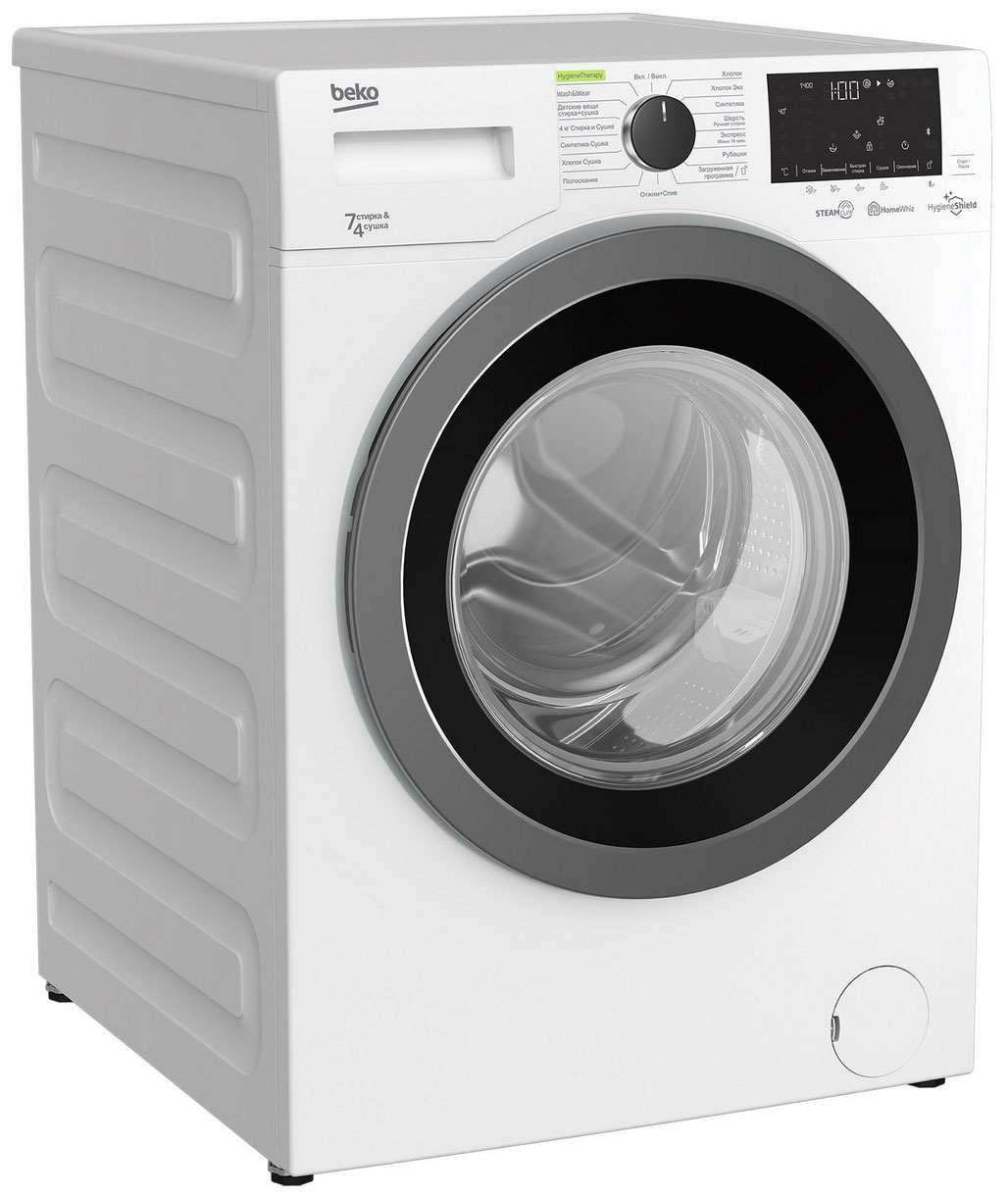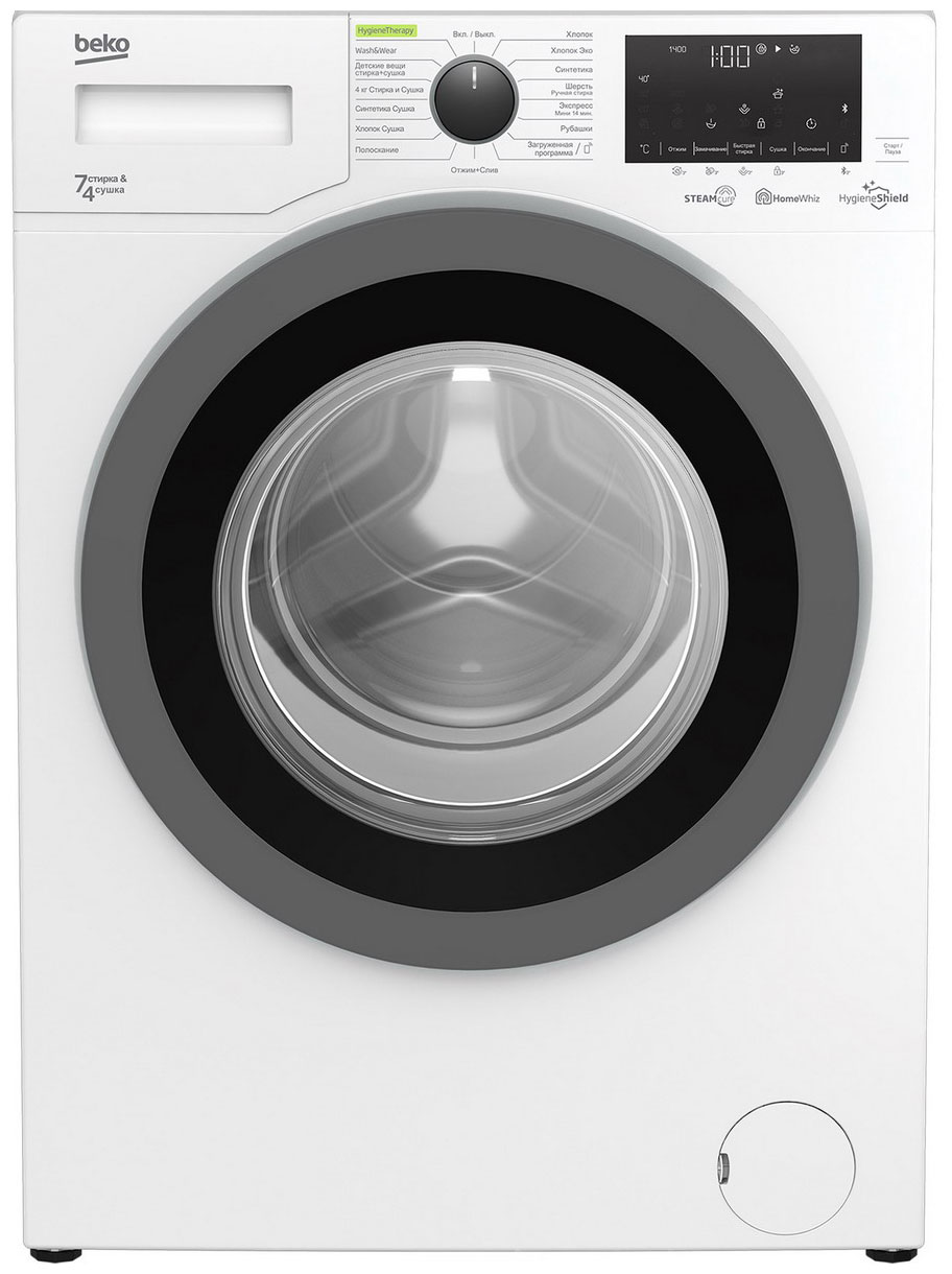 Белая стирально-сушильная машина шириной 60 см с сенсорным дисплеем. Вмещает 7 кг белья при стирке и 4 кг при сушке. Имеет 15 встроенных программ, автоматический контроль распределения белья, расхода воды и пенообразования, блокировку от детей. Оснащена технологией обработки паром SteamCure, которая размягчает въевшиеся загрязнения и облегчает глажку. Поддерживает управление через мобильное приложение HomeWhiz, которое позволяет включать и выключать машину, выбирать режим, а также следить за временем окончания программы. Надежность и долговечность обеспечивает нагревательный элемент Hi-Tech с никелированным покрытием, защищающим машину от накипи и ржавчины.