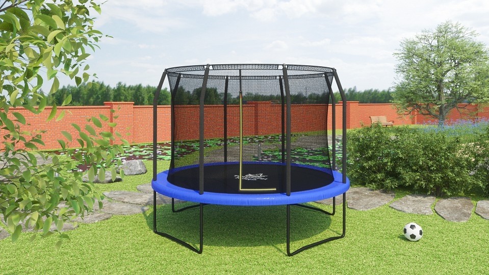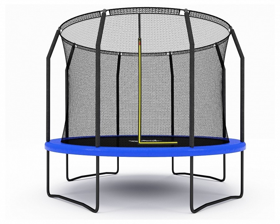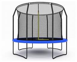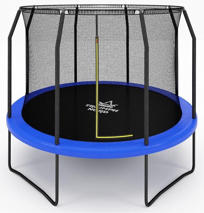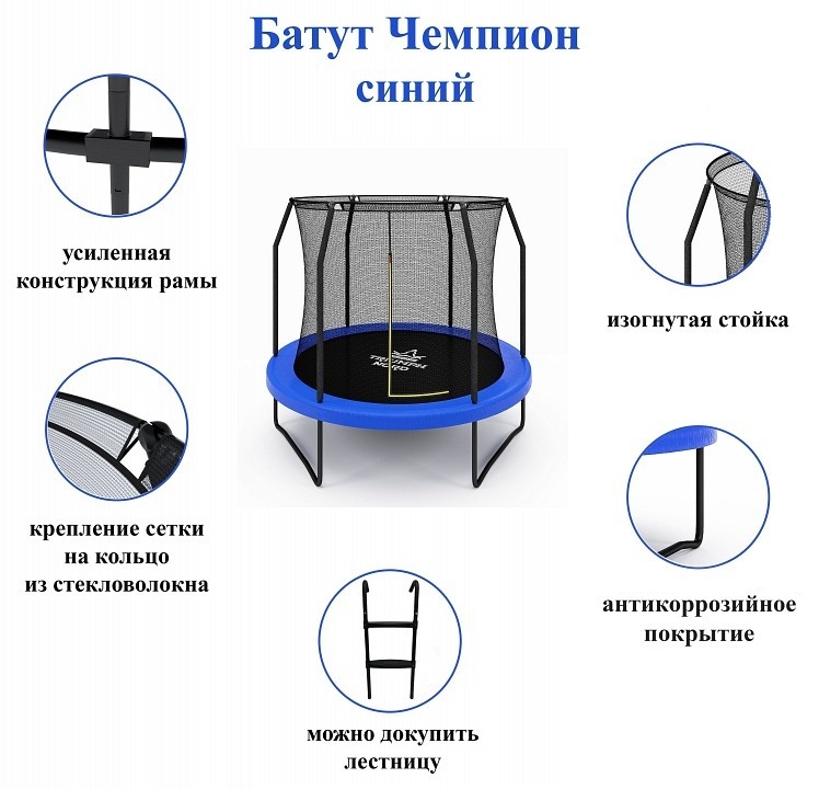 Материал корпуса: высокопрочный нейлон (РЕ), перматрон, сталь, Тип поверхности корпуса: глянцевый, матовый, Дополнительные параметры: высота от пола до основания - 760 мм, высота сетки - 1700 мм, диаметр мата - 2630 мм, колличество пружин - 64 шт, колличество ножек - 4 шт, диаметр ножки - 380 мм, материал мата - перматрон, материал сетки - высокопрочный нейлон (РЕ), материал подушки безопастности - ПВХ, вспененный полимер, Цвет корпуса: синий, черный