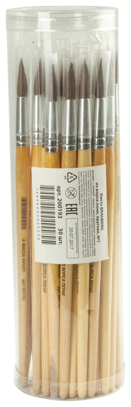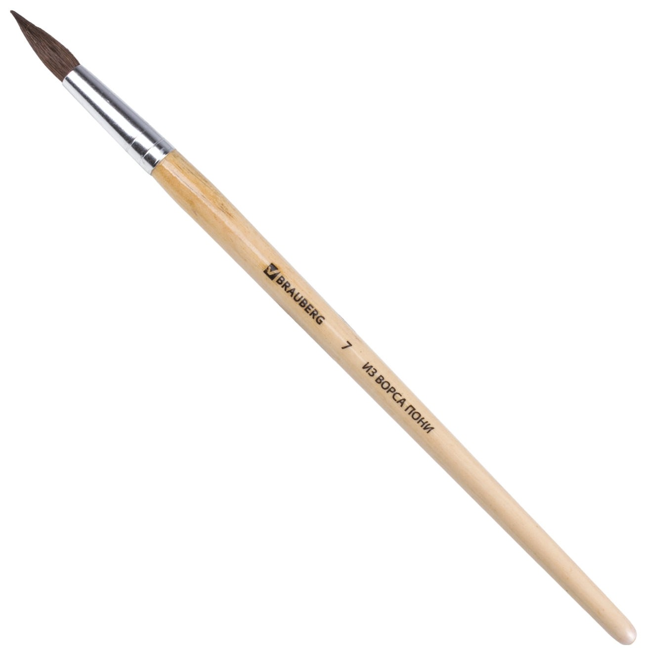 Круглая кисть из волоса пони. Хорошо сохраняет форму. Отлично удерживает краску. Подходит для работы с акварелью, гуашью, тушью. Снабжена защитным пластиковым колпачком.