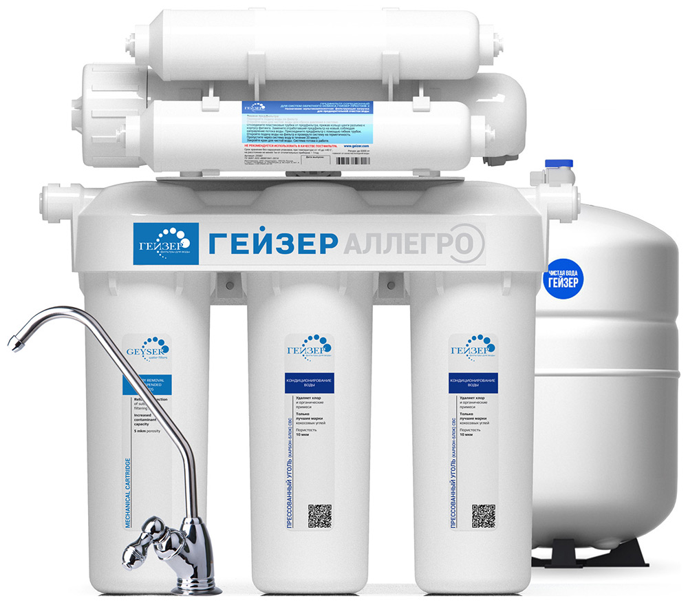 Технология обратного осмоса, использованная в фильтре Гейзер Аллегро , заключается в фильтровании воды через полупроницаемую мембрану. Размеры пор мембраны настолько малы, что пропускают только молекулы воды. Размер молекул большинства примесей, а также бактерий и вирусов значительно больше молекул воды, поэтому они не проходят через мембрану. Фильтр Гейзер Аллегро работает при давлении в подводящей магистрали не менее 2 атм.